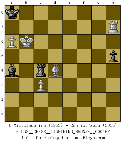 Last move : 1-0 2013 September 26 1:49:17 [Event "FICGS__CHESS__LIGHTNING_BRONZE__000462"] [Site "FICGS"] [Date "2013.09.26"] [Round "1"] [White "Ortiz,Clodomiro"] [Black "Schmid,Pablo"] [Result "1-0"] [WhiteElo "2265"] [BlackElo "2035"] 1.d4 d5 2.c4 c6 3.Nc3 e6 4.e3 Nf6 5.Nf3 Nbd7 6.Qc2 Bd6 7.Bd3 O-O 8.O-O dxc4 9.Bxc4 b5 10.Be2 Bb7 11.Rd1 Qc7 12.e4 e5 13.dxe5 Nxe5 14.Nd4 Neg4 15.g3 Bc5 16.Bxg4 Nxg4 17.Bf4 Qb6 18.Nce2 Rfe8 19.Rac1 Bf8 20.Nc3 Rad8 21.Nf5 g6 22.Nd6 Bxd6 23.Bxd6 c5 24.Bf4 c4 25.Nd5 Qc5 26.h3 Bxd5 27.hxg4 Bb7 28.Qc3 Rxd1+ 29.Rxd1 Bxe4 30.Bh6 f6 31.Qxf6 Qe7 32.Qxe7 Rxe7 33.Rd8+ Kf7 34.f3 Bd3 35.Rf8+ Ke6 36.Rb8 Kd6 37.Rxb5 Re1+ 38.Kg2 Re2+ 39.Kh3 Rf2 40.Kh4 Kc6 41.Rb8 Rxf3 42.Rc8+ Kd5 43.Bg7 Rf2 44.Kg5 Rh2 45.Bc3 h6+ 46.Kf6 Rg2 47.Rd8+ Kc6 48.Be5 Rh2 49.a4 Rf2+ 50.Ke6 Rf3 51.Rd7 Bc2 52.Rxa7 Bb3 53.Bc3 Rxg3 54.a5 Rxg4 55.Ra6+ Kb7 56.Rd6 Kb8 57.a6 Rf4 58.Kd5 Rf5+ 59.Kd4 h5 60.Rxg6 Rf8 61.Kc5 Ka7 62.Rd6 Rb8 63.Bd4 Rc8+ 64.Kb5 Ka8 65.Rd7 c3 66.Ra7+ Kb8 67.Rb7+ Ka8 68.Kb6 Rc4 69.bxc3 Ba4 70.Rh7 1-0 QGD Slav defense Kingside Castling by player Black (move 7) Kingside Castling by player White (move 8) 10 pieces endgame at move 60 : White KRBPP , Black KRBPP WHITE : King + 1 Rook 1 Bishop 2 Pawns BLACK : King + 1 Rook 1 Bishop 2 Pawns 9 pieces endgame at move 69 : White KRBPP , Black KRBP WHITE : King + 1 Rook 1 Bishop 2 Pawns BLACK : King + 1 Rook 1 Bishop 1 Pawn Player White won this chess game. Follow this game move after move (download)Castle early and often. (Rob Sillars) Frage: Gibt es etwas was Sie mehr lieben als Autobahnen ohne Tempobegrenzungen? - Antwort: Deutsche Frauen ohne Tempobegrenzungen. (Loek van Wely) Aunque la mayoría de la gente disfruta observar las partidas de los grandes Maestros de ataque, algunos de los jugadores mas notables en la historia han sido los jugadores silenciosos posicionales. Lentamente ellos te aplastan despojandote de tu espacio, congestionando tus piezas y dejandote virtualmente sin nada que hacer. (Yasser Seirawan) C'est la seule position que je connaisse où les deux camps sont mals. Propos prêtés à V. Anand. I would love to change the world, but they won't give me the source code. (Unknown)