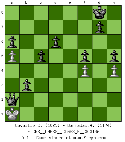 Last move : 0-1 2013 October 1 22:59:58 [Event "FICGS__CHESS__CLASS_F__000136"] [Site "FICGS"] [Date "2013.09.30"] [Round "1"] [White "Cavaille,Cedric"] [Black "Barradas,Anderson"] [Result "0-1"] [WhiteElo "1029"] [BlackElo "1174"] 1.e4 c5 2.c4 e5 3.Nf3 d6 4.Nc3 Nf6 5.d3 h6 6.Nd5 Nxd5 7.exd5 Bg4 8.Be2 Bxf3 9.Bxf3 a6 10.a3 b5 11.b3 Nd7 12.Bd2 Be7 13.a4 Bf6 14.Bc3 b4 15.Bb2 Nf8 16.a5 Ng6 17.Bc1 e4 18.Ra2 exf3 19.Qxf3 O-O 20.O-O Ne5 21.Qg3 Bh4 22.Qh3 Ng6 23.g3 Bf6 24.Qg4 Ne5 25.Qe2 Re8 26.Bf4 Ng6 27.Qd2 Nxf4 28.Qxf4 Bg5 29.Qf3 Ra7 30.Qd1 Rae7 31.f4 Bf6 32.R1f2 Bd4 33.Kf1 Bxf2 34.Kxf2 Re3 35.h4 Qd7 36.g4 h5 37.Re2 Rxe2+ 38.Qxe2 Rxe2+ 39.Kxe2 Qxg4+ 40.Ke3 f5 41.d4 Qg3+ 42.Kd2 Qc3+ 43.Ke2 Qxd4 44.Kf3 Qc3+ 45.Kf2 Qxb3 46.Ke2 Qxc4+ 47.Kd2 Qxd5+ 48.Kc2 Qc4+ 49.Kb2 Qc3+ 50.Kb1 Qd2 51.Ka1 b3 52.Kb1 Qc2+ 53.Ka1 Qa2+ 0-1 Sicilian defense Kingside Castling by player Black (move 19) Kingside Castling by player White (move 20) Player Black won this chess game. Follow this game move after move (download)When you play Bobby, it is not a question if you win or lose. It is a question if you survive. (Boris Spassky) Es gibt zwei Arten von Opfern: Korrekte und meine. (Mikhail Nekhemyevich Tal) El jugador táctico sabe que hacer cuando hay algo que hacer; mientras que el estratega sabe que hacer cuando no hay nada que hacer. (Gerald Abrahams) Il n'y a plus de joueurs du niveau de Jacob Murray dont la seule quête est le beau jeu, le plaisir de voir les pièces construire quelque chose. Sur 10 idées à la minute, 9 seront sans intérêt, la dernière s'avèrera géniale. (Christian Bauer) A generalist learns less and less about more and more until he knows nothing about everything. (Author unknown)