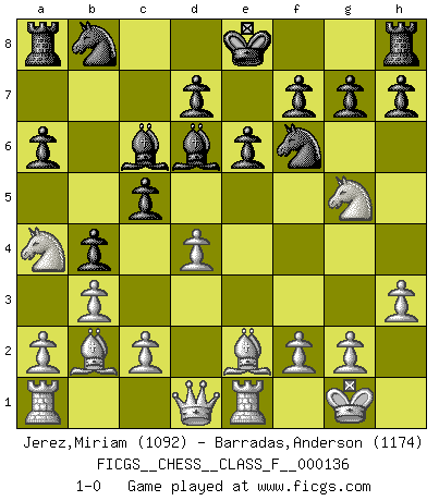 Last move : 1-0 2013 October 26 23:37:48 [Event "FICGS__CHESS__CLASS_F__000136"] [Site "FICGS"] [Date "2013.09.30"] [Round "1"] [White "Jerez,Miriam"] [Black "Barradas,Anderson"] [Result "1-0"] [WhiteElo "1092"] [BlackElo "1174"] 1.e4 c5 2.Bc4 e6 3.Nc3 a6 4.Nf3 b5 5.Be2 Bb7 6.b3 b4 7.Na4 Bxe4 8.O-O Qf6 9.Bb2 Qh6 10.h3 Nf6 11.d3 Bc6 12.Re1 Bd6 13.d4 Qg5 14.Nxg5 1-0 Sicilian defense Kingside Castling by player White (move 8) Player White won this chess game. Follow this game move after move (download)If I win a tournament, I win it by myself. I do the playing. Nobody helps me. (Bobby Fischer) Es hat in meinem Leben Zeiten gegeben, da ich sehr nahe daran war zu glauben, daß ich auch nicht eine einzige Schachpartie verlieren könnte. (José Raúl Capablanca) Estaba muy claro de que el punto vulnerable del Gran Maestro Americano (Bobby Fischer) radicaba en las posiciones de doble filo, colgantes, irracionales, donde el siempre falló en encontrar un triunfo aún en una posición de clara victoria. (Efim Geller) Le joueur d'Echecs qui veut atteindre le top est obligé de développer son propre credo créatif. Alexeï Stepanovicth Souétine. Il est facile d'écrire des livres ! Ce qui est difficile, c'est de jouer ! (Alexeï Stepanovicth Souétine) Knowledge will give you power, but character respect. (Bruce Lee)