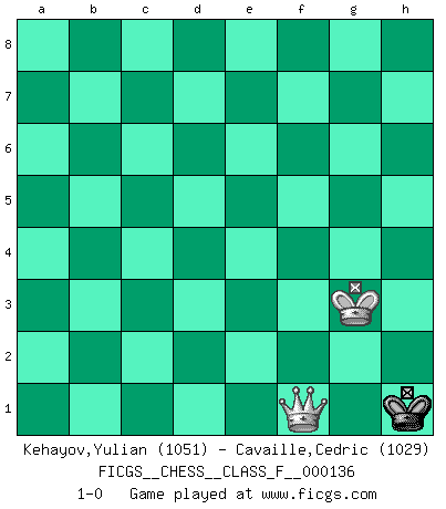 Last move : 1-0 2013 October 3 18:9:5 [Event "FICGS__CHESS__CLASS_F__000136"] [Site "FICGS"] [Date "2013.09.30"] [Round "1"] [White "Kehayov,Yulian"] [Black "Cavaille,Cedric"] [Result "1-0"] [WhiteElo "1051"] [BlackElo "1029"] 1.e4 e5 2.d4 exd4 3.Qxd4 d6 4.Be2 Qf6 5.Nf3 Qxd4 6.Nxd4 Nf6 7.Nc3 Bd7 8.O-O Nc6 9.Nd5 Nxd5 10.Nxc6 Bxc6 11.exd5 Bxd5 12.Re1 Be7 13.Bd3 Be6 14.h3 O-O 15.Be4 d5 16.Bxd5 Bxd5 17.Rxe7 Rac8 18.Bf4 f6 19.Bxc7 Rf7 20.Rxf7 Kxf7 21.Bf4 Rxc2 22.Be3 Rxb2 23.Bxa7 Rxa2 24.Rxa2 Bxa2 25.f3 b5 26.Bc5 Ke6 27.Bd4 Kd5 28.Ba1 Kc4 29.f4 b4 30.Kf2 Kd3 31.g3 b3 32.h4 Kc2 33.Bd4 b2 34.Bxb2 Kxb2 35.Ke3 Kc3 36.Ke4 Bb1+ 37.Kd5 Kd2 38.Ke6 h5 39.Kf7 Ke3 40.Kxg7 f5 41.Kg6 Kf3 42.Kxh5 Kxg3 43.Kg5 Be4 44.h5 Bd5 45.h6 Bg8 46.Kxf5 Kh4 47.Kg6 Kg4 48.f5 Bh7+ 49.Kxh7 Kxf5 50.Kg7 Kg5 51.h7 Kh5 52.h8Q+ Kg4 53.Qf8 Kg5 54.Qf6+ Kg4 55.Qe5 Kf3 56.Qd4 Ke2 57.Qc3 Kf2 58.Qd3 Ke1 59.Qc2 Kf1 60.Qd2 Kg1 61.Qe2 Kh1 62.Kg6 Kg1 63.Kg5 Kh1 64.Kg4 Kg1 65.Kg3 Kh1 66.Qf1+ 1-0 Centre game Kingside Castling by player White (move 8) Kingside Castling by player Black (move 14) 10 pieces endgame at move 34 : White KBPPP , Black KBPPP WHITE : King + 1 Bishop 3 Pawns BLACK : King + 1 Bishop 3 Pawns 9 pieces endgame at move 34 : White KPPP , Black KBPPP WHITE : King + 3 Pawns BLACK : King + 1 Bishop 3 Pawns 8 pieces endgame at move 40 : White KPPP , Black KBPP WHITE : King + 3 Pawns BLACK : King + 1 Bishop 2 Pawns 7 pieces endgame at move 42 : White KPPP , Black KBP WHITE : King + 3 Pawns BLACK : King + 1 Bishop 1 Pawn 6 pieces endgame at move 42 : White KPP , Black KBP WHITE : King + 2 Pawns BLACK : King + 1 Bishop 1 Pawn 5 pieces endgame at move 46 : White KPP , Black KB WHITE : King + 2 Pawns BLACK : King + 1 Bishop 4 pieces endgame at move 49 : White KPP , Black K WHITE : King + 2 Pawns BLACK : King + 3 pieces endgame at move 49 : White KP , Black K WHITE : King + 1 Pawn BLACK : King + Promotion Queen by player White (move 52) Player White won this chess game. Follow this game move after move (download)Combinations have always been the most intriguing aspect of Chess. The masters look for them, the public applauds them, the critics praise them. It is because combinations are possible that Chess is more than a lifeless mathematical exercise. They are the poetry of the game; they are to Chess what melody is to music. They represent the triumph of mind over matter. (Reuben Fine) Gegen einen Schachcomputer zu verlieren ist wie Löcher in den Strümpfen zuhaben. Es ist nicht peinlich, solange man der einzige ist der es weiß. (Anonymous) La única cosa que los jugadores de Ajedrez tienen en común, es el Ajedrez. (Lodewijk Prins) Plusieurs personnes se sont demandées comment Tal faisait pour gagner... En fait, c'est très simple ! Il met ses pièces au centre de l'échiquier et les sacrifie quelque part ! (David Bronstein) After growing wildly for years, the field of computing appears to be reaching its infancy. (John Pierce)