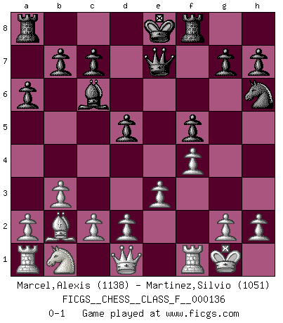 Last move : 0-1 2014 January 14 23:12:16 [Event "FICGS__CHESS__CLASS_F__000136"] [Site "FICGS"] [Date "2013.09.30"] [Round "1"] [White "Marcel,Alexis"] [Black "Martinez,Silvio"] [Result "0-1"] [WhiteElo "1138"] [BlackElo "1051"] 1.f4 Nh6 2.Nf3 Nc6 3.e3 d5 4.Bb5 Bd7 5.O-O a6 6.Bxc6 Bxc6 7.b3 e6 8.Bb2 f6 9.Nd4 f5 10.Nxe6 Qe7 11.Nxf8 Rxf8 0-1 Bird's Opening Kingside Castling by player White (move 5) Player Black won this chess game. Follow this game move after move (download)When you don't know what to play, wait for an idea to come into your opponent's mind. You may be sure that idea will be wrong. (Siegbert Tarrasch) Ich verstehe Aljechins Kombinationen ganz gut; aber woher er diese Angriffschancen bekommt und wie er die Eröffnung behandelt das ist für mich ein Buch mit sieben Siegeln. (Rudolf Spielmann) El Ajedrez es un juego terrible. Si no dominas el centro, tu oponente tiene una posición mas libre. Si tu tienes el centro, entonces realmente tienes algo de que preocuparte. (Siegbert Tarrasch) À la honte des hommes, on sait que les lois du jeu sont les seules qui soient partout justes, claires, inviolables et exécutées. Pourquoi l'Indien qui a donné les règles du jeu d'échecs est-il obéi de bon gré dans toute la terre, et que les décrétales des papes, par exemple, sont aujourd'hui un objet d'horreur et de mépris ? C'est que l'inventeur des échecs combina tout avec justesse pour la satisfaction des joueurs, et que les papes, dans leurs décrétales, n'eurent en vue que leur seul avantage. L'Indien voulut exercer également l'esprit des hommes et leur donner du plaisir; les papes ont voulu abrutir l'esprit des hommes. Voltaire (Dictionnaire philosophique / Garnier 1967) Warrior pose battles inner weakness and wins focus. You see that there is no war within you. You're on your own side, and you are your own strength. (Terri Guillemets)