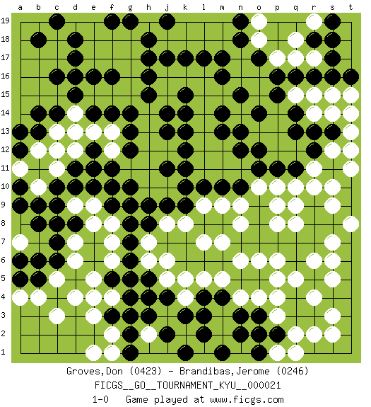 Last move : 1-0 2007 May 29 10:15:16 [Event "FICGS__GO__TOURNAMENT_KYU__000021"] [Site "FICGS"] [Date "2007.02.06"] [Round "1"] [Black "Groves,Don"] [White "Brandibas,Jerome"] [Result "1-0"] [Rating 1 "0423"] [Rating 2 "0246"] 1.q3 d4 2.q16 p4 3.q4 q5 4.r5 r6 5.q6 p5 6.r7 s6 7.p7 r4 8.r3 s5 9.o3 p3 10.p2 o4 11.n3 n4 12.d17 s3 13.m4 m5 14.l4 s2 15.n7 q2 16.o2 p6 17.q7 k4 18.k3 l5 19.j4 k5 20.f3 f4 21.g4 e3 22.g3 m3 23.l3 m2 24.l2 n1 25.n2 m7 26.m8 l7 27.l8 k8 28.c14 n8 29.o8 n9 30.l10 l9 31.m10 m9 32.o9 o6 33.o7 n6 34.n10 j5 35.h5 j3 36.h4 o10 37.o11 p10 38.p11 q10 39.q11 r11 40.r12 s10 41.r9 s9 42.s8 q9 43.s11 r10 44.r8 s12 45.s13 t11 46.q13 t8 47.f5 e4 48.k17 s7 49.h8 h6 50.g6 h7 51.g7 j8 52.h9 e5 53.j9 f6 54.g5 f7 55.f9 h2 56.g2 k2 57.m1 f8 58.g8 e9 59.f10 f12 60.e10 d9 61.d10 d12 62.c10 g11 63.c9 c8 64.b8 h10 65.k10 p8 66.c7 e8 67.d8 d6 68.c6 d7 69.c8 c5 70.f14 h14 71.g13 f13 72.g14 h13 73.j11 j12 74.k12 h11 75.j13 h12 76.j14 j10 77.k11 j15 78.k14 g15 79.h16 f15 80.e14 g16 81.h15 j16 82.h17 k16 83.j17 l16 84.m17 l14 85.m16 m15 86.m13 l13 87.k13 m12 88.n13 n11 89.k9 l12 90.n15 n14 91.m14 l15 92.o14 g17 93.e16 e15 94.d15 f18 95.l17 m11 96.o12 l11 97.k1 f2 98.g1 e1 99.j2 e13 100.e11 c13 101.b13 b12 102.b14 c11 103.d11 b10 104.a12 a11 105.a13 d13 106.b9 d14 107.c16 e18 108.d18 e17 109.a9 c12 110.h18 g18 111.f16 d19 112.c19 e19 113.b18 f17 114.d16 h19 115.j19 t13 116.t14 t12 117.g19 s14 118.r13 r14 119.s16 t15 120.t16 s15 121.q14 q15 122.p15 r15 123.r16 t14 124.f19 b6 125.a10 p17 126.p16 q17 127.o17 o18 128.n18 o19 129.n19 q18 130.s18 r17 131.s17 r19 132.r18 b7 133.g9 a7 134.n12 p9 135.g12 q8 136.f11 r2 137.g10 f1 138.e12 p1 139.o1 q1 140.k15 j6 141.s19 a8 142.b5 b4 143.a6 a4 144.a5 c3 145.h3 a7 146.b6 1-0 Here are the names of the openings (joseki) played in the four corners : Corner q4 : q3 p4 Komoku (Somok, Xiao~mu`) 3-4 Point. The komoku (3-4) point is the traditional corner enclosure move.. Corner d4 : d4 j4 Hoshi (Hwajeom, Seongjeom, Xingwei`) 4-4 Point. The star or hoshi (4-4) point, emphasizing influence at the potential expense of territory. Player Black won this Go (weiqi, baduk) game. Follow this game move after move (download)Big groups never die. (Anonymous) Life is painting a picture, not doing a sum. (Oliver Wendell Holmes, Jr.)