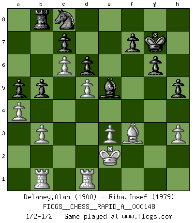 Last move : 1/2-1/2 2013 November 26 10:57:45 [Event "FICGS__CHESS__RAPID_A__000148"] [Site "FICGS"] [Date "2013.09.30"] [Round "1"] [White "Delaney,Alan"] [Black "Riha,Josef"] [Result "1/2-1/2"] [WhiteElo "1900"] [BlackElo "1979"] 1.Nf3 Nf6 2.g3 g6 3.Bg2 Bg7 4.O-O O-O 5.c4 d6 6.d4 Nc6 7.Nc3 a6 8.Bf4 Bd7 9.Qd2 Rb8 10.c5 Re8 11.d5 Na5 12.e4 b5 13.c6 Bg4 14.h3 Bxf3 15.Bxf3 Nc4 16.Qc2 Qc8 17.Bg2 e6 18.Rab1 h5 19.Rfd1 exd5 20.Nxd5 Nxd5 21.exd5 Qd8 22.Bc1 Nb6 23.b3 Qf6 24.Be3 Rxe3 25.fxe3 Qg5 26.Qe4 Qxg3 27.Qf4 Be5 28.Qxg3 Bxg3 29.Bf3 Be5 30.Kf2 a5 31.a4 Nc8 32.Ke2 Kg7 1/2-1/2 Reti : King's Indian attack Kingside Castling by player White (move 4) Kingside Castling by player Black (move 4) This chess game ended in a draw. Follow this game move after move (download)I had a toothache during the first game. In the second game I had a headache. In the third game it was an attack of rheumatism. In the fourth game, I wasn't feeling well. And in the fifth game? Well, must one have to win every game ? (Siegbert Tarrasch) Wenn Du absolut nicht mehr weißt, was Du tun sollst, dann ist es Zeit für Panik. (John van der Wiel) Debemos de asegurarnos de que el Ajedrez no se convierta en un lenguaje muerto, muy interesante, pero tan solo para un grupo muy pequeño. (Sytze Faber) Des combinaisons [dans le jeu d'échecs] pareilles à des mélodies. Je crois entendre pour ainsi dire la musique des coups... (Vladimir Nabokov) History is a gallery of pictures in which there are few originals and many copies. (Alexis de Tocqueville)