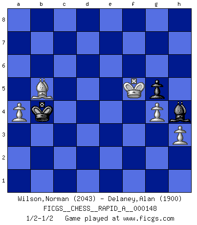 Last move : 1/2-1/2 2014 January 17 11:11:28 [Event "FICGS__CHESS__RAPID_A__000148"] [Site "FICGS"] [Date "2013.09.30"] [Round "1"] [White "Wilson,Norman"] [Black "Delaney,Alan"] [Result "1/2-1/2"] [WhiteElo "2043"] [BlackElo "1900"] 1.e4 e5 2.Nf3 Nf6 3.Nxe5 d6 4.Nf3 Nxe4 5.d4 d5 6.Bd3 Nc6 7.O-O Be7 8.c4 Nb4 9.Be2 O-O 10.a3 Nc6 11.cxd5 Qxd5 12.Nc3 Nxc3 13.bxc3 Bf5 14.Bf4 Na5 15.Bxc7 Rac8 16.Bxa5 Qxa5 17.c4 Bf6 18.Bd3 Be6 19.Qb3 Rfd8 20.Rfd1 g6 21.Bf1 b5 22.Qxb5 Qxb5 23.cxb5 Bg4 24.Rd3 Bxf3 25.Rxf3 Kg7 26.Ra2 Rxd4 27.g3 Ra4 28.Be2 Rc3 29.Rxc3 Bxc3 30.Bd1 Rd4 31.Bf3 Rd2 32.Rxd2 Bxd2 33.Be2 g5 34.Bd3 h6 35.Kg2 Kf6 36.Kf3 Be1 37.Ke3 Ke7 38.f4 f6 39.fxg5 fxg5 40.g4 Bc3 41.Ke4 Ke6 42.a4 Be1 43.h3 Bf2 44.Bc4+ Kd6 45.Kf5 Kc5 46.Be6 Kb4 47.Bd7 Ka5 48.Kg6 a6 49.Kxh6 Bh4 50.bxa6 Kxa6 51.Kg6 Ka5 52.Kf6 Kb4 53.Kf5 Ka5 54.Be8 Kb4 55.Bb5 1/2-1/2 Petrov : Classical attack Kingside Castling by player White (move 7) Kingside Castling by player Black (move 9) 10 pieces endgame at move 49 : White KBPPPP , Black KBPP WHITE : King + 1 Bishop 4 Pawns BLACK : King + 1 Bishop 2 Pawns 9 pieces endgame at move 50 : White KBPPPP , Black KBP WHITE : King + 1 Bishop 4 Pawns BLACK : King + 1 Bishop 1 Pawn 8 pieces endgame at move 50 : White KBPPP , Black KBP WHITE : King + 1 Bishop 3 Pawns BLACK : King + 1 Bishop 1 Pawn This chess game ended in a draw. Follow this game move after move (download)Chess teaches you to control the initial excitement you feel when you see something that looks good and it trains you to think objectively when you're in trouble. (Stanley Kubrick) Capablanka war das größte Genie der Schachgeschichte! Aber denken sie nicht er habe nichts vom Schach verstanden. Er wusste nur soviel wie er wissen musste um seine Ziele zu erreichen. (Mikhail Moiseyevich Botvinik) Desconfianza es la característica mas necesaria de un jugador de Ajedrez. (Siegbert Tarrasch) Aucun coup ne doit être joué sans but. (Pedro Damiano) It's not the will to win, but the will to prepare to win that makes the difference. (Bear Bryant)
