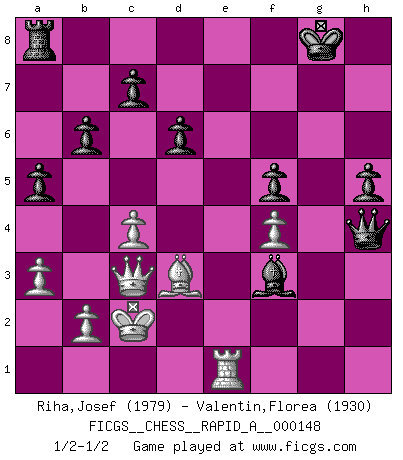 Last move : 1/2-1/2 2013 November 12 18:4:52 [Event "FICGS__CHESS__RAPID_A__000148"] [Site "FICGS"] [Date "2013.09.30"] [Round "1"] [White "Riha,Josef"] [Black "Valentin,Florea"] [Result "1/2-1/2"] [WhiteElo "1979"] [BlackElo "1930"] 1.d4 Nf6 2.c4 e6 3.Nc3 Bb4 4.Qc2 O-O 5.a3 Bxc3+ 6.Qxc3 b6 7.Bg5 Bb7 8.e3 d6 9.Ne2 Nbd7 10.Qd3 h6 11.Bh4 e5 12.Nc3 exd4 13.Qxd4 Re8 14.Rd1 g5 15.Bg3 Ne4 16.f3 Nxc3 17.Qxc3 Qe7 18.Kd2 f5 19.h4 g4 20.Be2 Nc5 21.Bf4 h5 22.Rde1 a5 23.Rhf1 Ne6 24.Bd3 Nxf4 25.exf4 Qxh4 26.Kc2 gxf3 27.gxf3 Rxe1 28.Rxe1 Bxf3 1/2-1/2 Nimzo-Indian : Classical variation Kingside Castling by player Black (move 4) This chess game ended in a draw. Follow this game move after move (download)You can only get good at Chess if you love the game. (Bobby Fischer) Wenn ich Weiß habe gewinne ich weil ich Weiß habe, wenn ich Schwarz habe gewinne ich weil ich Bogoljubov bin. (Efim Bogoljubov) Fischer sacrificó virtualmente todo lo que la mayoría de nosotros los 'debiles' (término que él usa) valoramos, respetamos y apreciamos por el amor de un astuto, a menudo hermoso tablero de juego, por el privilegio ambivalente de ser su mas grande maestro. (Paul Kollar) Vous m'avez demandé de vous exposer quel est le fondement de la prière. Je ne fais que préparer les pièces du jeu sur la table... Nous sera-t-il permis d'en adopter les règles et si nous les appliquons scrupuleusement nous ne tarderons pas à faire mat le Roi divin ! Il ne pourra échapper à nos mains. (Sainte Thérèse d'Avila, Chemin de perfection) He who laughs last probably does not get the joke. (Unknown)