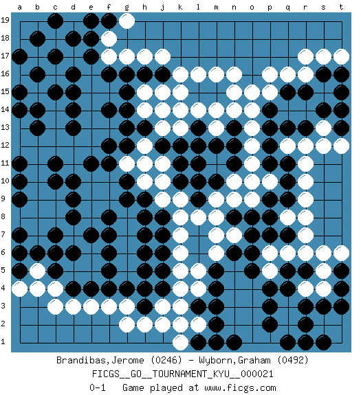 Last move : 0-1 2007 August 3 10:47:18 [Event "FICGS__GO__TOURNAMENT_KYU__000021"] [Site "FICGS"] [Date "2007.02.06"] [Round "1"] [Black "Brandibas,Jerome"] [White "Wyborn,Graham"] [Result "0-1"] [Rating 1 "0246"] [Rating 2 "0492"] 1.d4 p15 2.q5 e14 3.d10 k7 4.d16 f18 5.f16 h17 6.f14 e13 7.f12 f13 8.g13 e12 9.f11 r7 10.q7 r8 11.q10 q8 12.p8 q6 13.p7 p6 14.o6 r6 15.r5 p5 16.o5 f15 17.g14 l16 18.g15 e15 19.d15 e16 20.e17 f17 21.g16 g17 22.e18 c18 23.d18 s5 24.p4 r4 25.q4 q3 26.r3 s4 27.p3 q2 28.r2 r10 29.p2 c12 30.c17 b10 31.c11 d11 32.c10 c14 33.e11 b11 34.d14 d12 35.d13 c13 36.c15 c9 37.d9 c8 38.d8 d7 39.e7 j3 40.c7 b9 41.d6 b7 42.b6 b12 43.a7 b8 44.b18 a8 45.a6 b15 46.b16 a16 47.b14 h12 48.h13 g11 49.g12 h10 50.g10 h11 51.h9 j9 52.j12 j11 53.k10 a13 54.a15 j10 55.k11 k9 56.l9 l8 57.a14 n7 58.n8 m8 59.o7 m6 60.n6 m7 61.q9 r9 62.q11 r11 63.m5 l5 64.m4 l4 65.l3 k4 66.h8 g8 67.g9 g7 68.h7 g6 69.h6 g5 70.j8 k8 71.h5 m9 72.l10 m11 73.m10 n10 74.l12 f3 75.f4 e3 76.g4 g3 77.h3 h4 78.j4 k3 79.m2 h2 80.h4 d3 81.e4 n16 82.n11 n9 83.o8 o11 84.n12 q12 85.p12 o12 86.p13 o13 87.m12 j13 88.k12 j14 89.q13 r12 90.p11 l14 91.n13 o14 92.m14 n14 93.m15 k15 94.l13 m16 95.l15 k14 96.q15 o10 97.p9 q16 98.p14 o15 99.r15 r16 100.s16 s17 101.t15 c4 102.c5 b4 103.r13 s13 104.s14 s12 105.t13 t12 106.t14 n15 107.a17 c3 108.b13 a12 109.a10 l2 110.m3 m1 111.k2 t2 112.s3 t3 113.q1 k1 114.l1 j2 115.n1 l2 116.m1 k2 117.h16 j17 118.j16 k16 119.f19 g19 120.e19 t17 121.t16 r17 122.s1 s2 123.r1 t1 124.t4 s6 125.t5 t6 126.t3 b5 127.a5 a4 128.c6 p16 129.f8 o9 130.j6 k6 131.a11 j15 132.a9 h15 133.f6 h14 134.f5 p10 135.j5 g2 136.f7 k5 137.j7 pass 138.c19 pass 139.pass pass 140.pass pass 141.pass pass 142.l11 m13 143.pass m14 144.pass k13 145.pass pass 146.pass pass 147.pass 0-1 Comment by player 1 : Jerome Brandibas : you need to finish the block in l15 m15 m14 l13 n13 Comment by player 2 : Graham Wyborn : Here are the names of the openings (joseki) played in the four corners : Corner d16 : e14 d16 This joseki is unknown. A weak or weird move has probably been played in this corner. Corner q4 : q5 r7 Takamoku (Gomok, Gaomu`) 5-4 Point. The takamoku (high) point (5-4). With its emphasis on influence, the 5-4 point complements the 4-4 (hoshi) point in creating an influence-oriented fuseki. Corner d4 : d4 c9 Hoshi (Hwajeom, Seongjeom, Xingwei`) 4-4 Point. The star or hoshi (4-4) point, emphasizing influence at the potential expense of territory. Player White won this Go (weiqi, baduk) game. Follow this game move after move (download)Win the early ko to win the game. (Anonymous) When you have everything, sometimes it feels like nothing. (Horatio Caine, C.S.I. Miami)