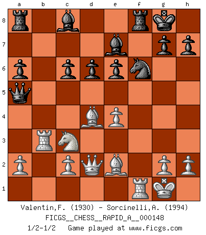 Last move : 1/2-1/2 2013 October 27 4:52:44 [Event "FICGS__CHESS__RAPID_A__000148"] [Site "FICGS"] [Date "2013.09.30"] [Round "1"] [White "Valentin,Florea"] [Black "Sorcinelli,Andrea"] [Result "1/2-1/2"] [WhiteElo "1930"] [BlackElo "1994"] 1.e4 c5 2.Nf3 d6 3.d4 cxd4 4.Nxd4 Nf6 5.Nc3 a6 6.Bg5 e6 7.f4 Qb6 8.Qd2 Qxb2 9.Rb1 Qa3 10.f5 Nc6 11.fxe6 fxe6 12.Nxc6 bxc6 13.Be2 Be7 14.O-O O-O 15.Rb3 Qc5+ 16.Be3 Qe5 17.Bf4 Qc5+ 18.Be3 Qe5 19.Bd4 Qa5 20.Bb6 Qe5 21.Bd4 Qa5 1/2-1/2 Sicilian : Najdorf, 7...Qb6 Kingside Castling by player White (move 14) Kingside Castling by player Black (move 14) This chess game ended in a draw. Follow this game move after move (download)Chess is a fighting game which is purely intellectual and includes chance. (Richard Reti) Im Leben werden Partien nie so unstrittig gewonnen wie im Spiel (Emanuel Lasker) Por esta medida (el intervalo entre Fischer y sus contemporaneos), yo le considero el mas grande campeón mundial. (Garry Kasparov) L'ordinateur a tué l'originalité. Il n'y a plus guère d'aventures sur l'échiquier. (Jacob Murray) Life is the sum of all your choices. (Albert Camus)