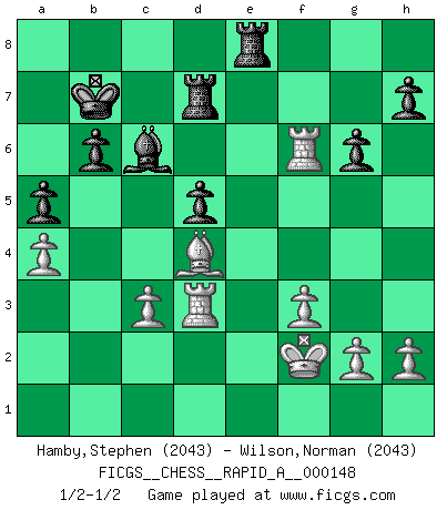Last move : 1/2-1/2 2013 December 8 19:28:17 [Event "FICGS__CHESS__RAPID_A__000148"] [Site "FICGS"] [Date "2013.09.30"] [Round "1"] [White "Hamby,Stephen"] [Black "Wilson,Norman"] [Result "1/2-1/2"] [WhiteElo "2043"] [BlackElo "2043"] 1.d4 Nf6 2.c4 e6 3.Nc3 Bb4 4.f3 d5 5.a3 Bxc3+ 6.bxc3 c5 7.cxd5 Nxd5 8.dxc5 f5 9.Nh3 Qa5 10.Nf4 Nc6 11.Nxd5 exd5 12.Qd3 Qxc5 13.a4 Be6 14.Ba3 Qa5 15.e3 O-O-O 16.Qd2 f4 17.Bb5 fxe3 18.Qxe3 Rhe8 19.Qc5 Bd7 20.Kf2 a6 21.Bd3 Qc7 22.Rab1 g6 23.Rhd1 Ne5 24.Qxc7+ Kxc7 25.Rb4 Nxd3+ 26.Rxd3 Bc6 27.Rf4 b6 28.Bc1 Rd7 29.Be3 a5 30.Rf6 Kb7 31.Bd4 1/2-1/2 Nimzo-Indian : Kmoch variation Queenside Castling by player Black (move 15) This chess game ended in a draw. Follow this game move after move (download)Chess books should be used as we use glasses: to assist the sight, although some players make use of them as if they thought they conferred sight. (Jose Raul Capablanca) Wenn sie aufgeben, dann danke ich Ihnen für das Spiel (Eventualzug beim Fernschach). (Anonymous) Diferente gente reacciona diferentemente en aceptar la derrota. (Bobby Fischer) Vouloir jouer aux échecs contre soi-même est aussi paradoxal que vouloir marcher sur son ombre. (Stefan Zweig) Be who you are, and say what you feel because those who mind don't matter, and those who matter don't mind. (Dr Seuss)