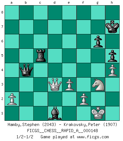 Last move : 1/2-1/2 2014 January 18 20:25:37 [Event "FICGS__CHESS__RAPID_A__000148"] [Site "FICGS"] [Date "2013.09.30"] [Round "1"] [White "Hamby,Stephen"] [Black "Krakovsky,Peter"] [Result "1/2-1/2"] [WhiteElo "2043"] [BlackElo "1907"] 1.Nf3 d5 2.g3 Nf6 3.Bg2 c5 4.O-O Nc6 5.d4 e6 6.c4 dxc4 7.Ne5 Bd7 8.Na3 cxd4 9.Naxc4 Bc5 10.Qb3 O-O 11.Bf4 Qc8 12.Rfd1 Rd8 13.Rac1 Nd5 14.Be4 Nxf4 15.gxf4 Be8 16.Qd3 f5 17.Bxc6 bxc6 18.Na5 Rd5 19.b4 Bd6 20.Naxc6 Qb7 21.Qf3 Rc8 22.Nxd4 Bxe5 23.fxe5 Rxc1 24.Rxc1 Qxb4 25.e3 Bd7 26.Nxf5 Rxe5 27.Qa8+ Kf7 28.Ng3 Rc5 29.Rd1 Bc6 30.Qxa7+ Kg6 31.h4 Bf3 32.Qe7 h5 33.Qxe6+ Kh7 34.Qd7 Bxd1 35.Qd3+ g6 1/2-1/2 Reti : King's Indian attack (Barcza system) Kingside Castling by player White (move 4) Kingside Castling by player Black (move 10) This chess game ended in a draw. Follow this game move after move (download)When your house is on fire, you can't be bothered with the neighbors. Or, as we say in Chess, if your King is under attack you don't worry about losing a Pawn on the Queen's side. (Gary Kasparov) Es ist wirklich schade, dass so viele Schachspieler nicht auf ihr Äußeres achten! (Alexandra Kosteniuk) El pensamiento metódico es mas útil en el Ajedrez que la inspiración. (C. J. S. Purdy) Toute estimation doit être constamment réévaluée. (Jacob Estrin) If things go wrong, don't go with them. (Roger Babson)