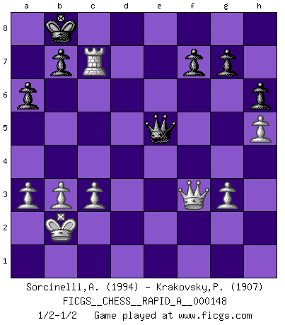 Last move : 1/2-1/2 2013 December 2 9:18:5 [Event "FICGS__CHESS__RAPID_A__000148"] [Site "FICGS"] [Date "2013.09.30"] [Round "1"] [White "Sorcinelli,Andrea"] [Black "Krakovsky,Peter"] [Result "1/2-1/2"] [WhiteElo "1994"] [BlackElo "1907"] 1.e4 c6 2.d4 d5 3.Nc3 dxe4 4.Nxe4 Bf5 5.Ng3 Bg6 6.h4 h6 7.Nf3 Nd7 8.h5 Bh7 9.Bd3 Bxd3 10.Qxd3 e6 11.Bd2 Ngf6 12.O-O-O Qc7 13.Ne4 O-O-O 14.g3 Nxe4 15.Qxe4 Nf6 16.Qe2 Rd5 17.Bf4 Bd6 18.Bxd6 Rxd6 19.Ne5 Rhd8 20.c3 Rd5 21.f4 Qe7 22.Kb1 Nd7 23.Nc4 Nb6 24.Ne3 R5d7 25.Nc2 c5 26.Rhe1 Rd5 27.b3 cxd4 28.Nxd4 Qf6 29.Kb2 Kb8 30.Rd2 Rc5 31.Red1 Rd7 32.Qf3 a6 33.a3 e5 34.fxe5 Qxe5 35.Nc6+ Rxc6 36.Rxd7 Nxd7 37.Rxd7 Rc7 38.Rxc7 1/2-1/2 Caro-Kann : Classical, 7...Nd7 Queenside Castling by player White (move 12) Queenside Castling by player Black (move 13) This chess game ended in a draw. Follow this game move after move (download)Chess opens and enriches your mind. (Saudin Robovic) Ich kämpfe solange mein Gegner einen Fehler machen kann. (Emanuel Lasker) El Ajedrez es despiadado: debes de estar preparado para matar gente. (Nigel Short) Si le désir cupide (et stupide) de gagner est une inépuisable source de souffrance, une combinaison brillante sur l'échiquier est une découverte : le coquelicot qui s'épanouit lorsque apparaît la Voie Lactée. (Arrabal) Lottery : A tax on people who are bad at math. (Author unknown)