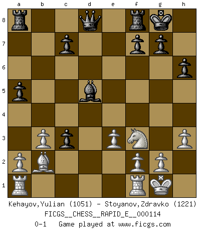 Last move : 0-1 2013 October 5 21:11:5 [Event "FICGS__CHESS__RAPID_E__000114"] [Site "FICGS"] [Date "2013.09.30"] [Round "1"] [White "Kehayov,Yulian"] [Black "Stoyanov,Zdravko"] [Result "0-1"] [WhiteElo "1051"] [BlackElo "1221"] 1.d4 d5 2.e3 a6 3.h3 Nc6 4.Nf3 h6 5.Be2 e6 6.O-O Be7 7.c4 dxc4 8.Bxc4 Nf6 9.Nc3 O-O 10.b3 b5 11.Be2 Bb4 12.Bb2 Bxc3 13.Bxc3 b4 14.Bb2 Bd7 15.Bc4 a5 16.d5 exd5 17.Bxd5 Nxd5 18.Qxd5 Be6 19.Qxc6 Bd5 20.Qc3 bxc3 0-1 Queen's pawn game Kingside Castling by player White (move 6) Kingside Castling by player Black (move 9) Player Black won this chess game. Follow this game move after move (download)The passed pawn is a criminal, who should be kept under lock and key. Mild measures, such as police surveillance, are not sufficient. (Nimzovitch) Wenn ich mich einlogge, glauben die Leute gewöhnlich nicht, dass ich es selbst bin und sie fangen an, mir dumme Fragen zu stellen. Und wenn sie es glauben, stellen sie wieder andere dumme Fragen. (Judith Polgar) Si no le temes a Spassky, entonces elimino el elemento del dinero. (Jim Slater) Shah mat. Le roi est mort. Cri de fierté d'un joueur venant de terrasser son adversaire, courtoisement, sans effusion de sang. Crush them ! Make them suffer ! (General Grievous in Star Wars ep.3)