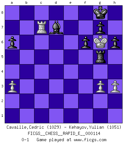 Last move : 0-1 2013 October 1 23:56:55 [Event "FICGS__CHESS__RAPID_E__000114"] [Site "FICGS"] [Date "2013.09.30"] [Round "1"] [White "Cavaille,Cedric"] [Black "Kehayov,Yulian"] [Result "0-1"] [WhiteElo "1029"] [BlackElo "1051"] 1.e4 e5 2.Nf3 d6 3.d4 exd4 4.Nxd4 Nf6 5.Bg5 Be7 6.Nc3 h6 7.Bxf6 Bxf6 8.Qd2 O-O 9.Bd3 Bxd4 10.O-O Bxc3 11.Qxc3 Nc6 12.b4 Qe7 13.a3 Qe5 14.Qxe5 Nxe5 15.f4 Nxd3 16.cxd3 Bd7 17.e5 dxe5 18.fxe5 Be6 19.d4 a6 20.Rad1 Rad8 21.Rd2 Rd5 22.Rb1 Rfd8 23.Rbd1 b6 24.Kf2 c5 25.bxc5 bxc5 26.Ke3 cxd4+ 27.Rxd4 Rxe5+ 28.Kf3 Rxd4 29.Rxd4 Ra5 30.Rd3 Rf5+ 31.Ke3 Ra5 32.g3 Bc4 33.Rc3 Bb5 34.Kd4 Ra4+ 35.Ke5 f6+ 36.Kf5 Rd4 37.h3 Bd7+ 38.Kg6 Rd5 39.Rc7 Rg5+ 0-1 Philidor : Exchange variation Kingside Castling by player Black (move 8) Kingside Castling by player White (move 10) Player Black won this chess game. Follow this game move after move (download)Morphy was probably the greatest genius of them all. (Bobby Fischer) Der Bart als Geschlechtszeichen mitten im Gesicht ist obszön. Daher gefällt er den Weibern. [Zugegeben, kein Schachzitat, aber unglaublich originell] (Arthur Schopenhauer) La táctica fluye a partir de una posición superior. (Bobby Fischer) La vie est comme un jeu d'échecs : nous esquissons un plan, mais celui-ci est tributaire de ce que daignent faire l'adversaire aux échecs et le destin dans la vie. (Arthur Schopenhauer) Players are not good because they find tactics, it is about the way to find the positions in which those tactics are hidden. (Luc-Olivier Leclerc)