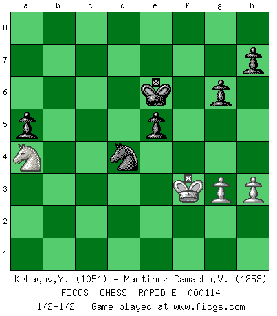 Last move : 1/2-1/2 2013 December 20 21:55:6 [Event "FICGS__CHESS__RAPID_E__000114"] [Site "FICGS"] [Date "2013.09.30"] [Round "1"] [White "Kehayov,Yulian"] [Black "Martinez Camacho,Victor Hugo"] [Result "1/2-1/2"] [WhiteElo "1051"] [BlackElo "1253"] 1.d4 Nf6 2.Nc3 e6 3.a3 c5 4.dxc5 Bxc5 5.e3 O-O 6.Nf3 Nc6 7.Na4 Bb6 8.Nxb6 Qxb6 9.Be2 Rd8 10.O-O d5 11.c3 Bd7 12.h3 Rac8 13.Qc2 Na5 14.Rb1 Qb3 15.Qxb3 Nxb3 16.Nd2 Nxc1 17.Rfxc1 Ba4 18.Bd1 Bxd1 19.Rxd1 Nd7 20.Nf3 f6 21.b3 Rxc3 22.Rdc1 Rdc8 23.Rxc3 Rxc3 24.a4 Nc5 25.b4 Nxa4 26.Nd4 e5 27.Ne2 Rc2 28.Kf1 Kf7 29.Ng3 g6 30.b5 Rb2 31.Rxb2 Nxb2 32.Ne2 a6 33.bxa6 bxa6 34.Nc3 Ke6 35.Ke2 Nc4 36.Na4 a5 37.Kd3 Nd6 38.f3 Nb7 39.g3 f5 40.e4 dxe4+ 41.fxe4 fxe4+ 42.Kxe4 Nd6+ 43.Ke3 Nf5+ 44.Kf3 Nd4+ 45.Ke4 Ne2 46.Kf3 Nd4+ 1/2-1/2 Queen's pawn game Kingside Castling by player Black (move 5) Kingside Castling by player White (move 10) 10 pieces endgame at move 42 : White KNPP , Black KNPPPP WHITE : King + 1 Knight 2 Pawns BLACK : King + 1 Knight 4 Pawns This chess game ended in a draw. Follow this game move after move (download)It is not a move, even the best move that you must seek, but a realizable plan. (Eugene Znosko-Borovsky) Herr Iljumschinow ist ein etwas merkwürdiger Geschäftsmann: Er arbeitet zusammen mit Leuten wie Muammar al-Gaddafi; früher ist das Saddam Hussein gewesen. (Joel Lautier) Uno no tiene que jugar muy bien, es suficiente jugar mejor que el oponente. (Siegbert Tarrasch) L'action d'une oeuvre littéraire se déroule sur un champ de bataille. Les masques et les types du drame moderne correspondent aux pièces du jeu d'échecs. L'intrigue correspond aux coups et aux gambits, c'est à dire aux techniques du jeu telles qu'utilisées et interprétées par les joueurs. Les tactiques et les péripéties [mouvements] correspondent aux coups exécutés par l'adversaire. (Viktor Shklovsky) However beautiful the strategy, you should occasionally look at the results. (Winston Churchill)