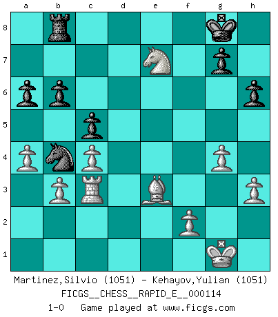Last move : 1-0 2014 March 29 5:38:44 [Event "FICGS__CHESS__RAPID_E__000114"] [Site "FICGS"] [Date "2013.09.30"] [Round "1"] [White "Martinez,Silvio"] [Black "Kehayov,Yulian"] [Result "1-0"] [WhiteElo "1051"] [BlackElo "1051"] 1.e4 e5 2.Nf3 d6 3.d4 exd4 4.Nxd4 Nf6 5.Nc3 Bd7 6.Bc4 Be7 7.O-O O-O 8.Re1 c6 9.h3 c5 10.Nf3 a6 11.a4 Nc6 12.b3 h6 13.Re2 Be6 14.Bxe6 fxe6 15.Bb2 e5 16.Nd5 Rf7 17.Nxe7+ Qxe7 18.Rd2 Rd8 19.Qe2 d5 20.exd5 Nxd5 21.c4 Nf4 22.Qe3 Rxd2 23.Nxd2 Nb4 24.Rc1 Qd6 25.Bxe5 Qe6 26.Bxf4 Qxe3 27.Bxe3 b6 28.Ne4 Re7 29.Nd6 Nd3 30.Rc3 Nb4 31.Nc8 Rb7 32.g4 Rb8 33.Ne7+ 1-0 Philidor : Exchange variation Kingside Castling by player White (move 7) Kingside Castling by player Black (move 7) Player White won this chess game. Follow this game move after move (download)Adequate compensation for a sacrifice is having a sound combination leading to a winning position; adequate compensation for a blunder is having your opponent snatch defeat from the jaws of victory. (Bruce A. Moon) Irgendwie scheint mir sonntags früh um 9 Uhr der Killerinstinkt verloren gegangen zu sein. (Alexej Shirov) Después de la respuesta de las negras a 1.e4 con 1..e5, se quedan siempre tratando de entrar dentro del juego. (Howard Staunton) Le jeu d'échecs est comme rejeté hors du temps. (Antoine de Saint-Exupéry) Creativity is allowing yourself to make mistakes. Art is knowing which ones to keep. (Scott Adams)