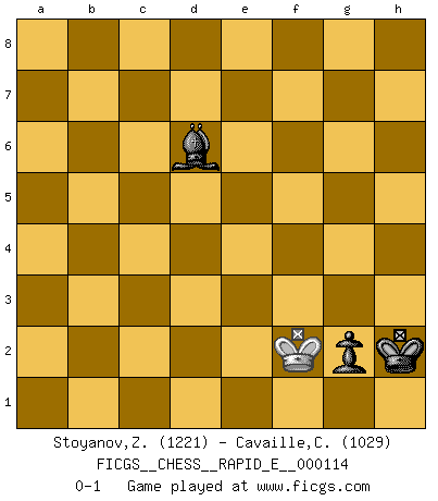 Last move : 0-1 2013 October 5 21:17:34 [Event "FICGS__CHESS__RAPID_E__000114"] [Site "FICGS"] [Date "2013.09.30"] [Round "1"] [White "Stoyanov,Zdravko"] [Black "Cavaille,Cedric"] [Result "0-1"] [WhiteElo "1221"] [BlackElo "1029"] 1.e4 e5 2.Nf3 d5 3.d3 Nc6 4.h3 d4 5.Be2 Nf6 6.Bg5 Be7 7.O-O O-O 8.Nbd2 b5 9.a3 a5 10.Re1 Bb7 11.c3 dxc3 12.bxc3 b4 13.Bxf6 Bxf6 14.cxb4 axb4 15.Qb3 Be7 16.axb4 Rxa1 17.Rxa1 Bxb4 18.Nc4 Qe7 19.Ncxe5 Nxe5 20.Ra7 Nxf3+ 21.Bxf3 Bc8 22.d4 Qd6 23.Qc4 c5 24.dxc5 Qxc5 25.Qxc5 Bxc5 26.Ra8 Bd6 27.Be2 Bb7 28.Ra4 g5 29.g3 f5 30.Bd3 fxe4 31.Bxe4 Bxe4 32.Rxe4 Bc5 33.Re2 Kg7 34.Kg2 Kg6 35.Re6+ Rf6 36.Rxf6+ Kxf6 37.f4 Kf5 38.fxg5 Kxg5 39.Kf3 Kf5 40.h4 h5 41.g4+ hxg4+ 42.Kg3 Bd6+ 43.Kg2 Kg6 44.Kg1 Kh5 45.Kh1 g3 46.Kg1 Kxh4 47.Kg2 Bc7 48.Kg1 Kh3 49.Kh1 g2+ 50.Kg1 Bd6 51.Kf2 Kh2 0-1 QP counter-gambit (elephant gambit) Kingside Castling by player White (move 7) Kingside Castling by player Black (move 7) 10 pieces endgame at move 32 : White KRPPP , Black KRBPP WHITE : King + 1 Rook 3 Pawns BLACK : King + 1 Rook 1 Bishop 2 Pawns 9 pieces endgame at move 36 : White KRPPP , Black KBPP WHITE : King + 1 Rook 3 Pawns BLACK : King + 1 Bishop 2 Pawns 8 pieces endgame at move 36 : White KPPP , Black KBPP WHITE : King + 3 Pawns BLACK : King + 1 Bishop 2 Pawns 7 pieces endgame at move 38 : White KPPP , Black KBP WHITE : King + 3 Pawns BLACK : King + 1 Bishop 1 Pawn 6 pieces endgame at move 38 : White KPP , Black KBP WHITE : King + 2 Pawns BLACK : King + 1 Bishop 1 Pawn 5 pieces endgame at move 41 : White KP , Black KBP WHITE : King + 1 Pawn BLACK : King + 1 Bishop 1 Pawn 4 pieces endgame at move 46 : White K , Black KBP WHITE : King + BLACK : King + 1 Bishop 1 Pawn Player Black won this chess game. Follow this game move after move (download)Chess is mental torture. (Garry Kasparov) Mein Name ist Rustam Kamsky. Sie haben meinen Sohn belästigt. Bereiten Sie sich aufs Sterben vor. (Rustam Kamsky) La batalla por la última verdad nunca sera ganada. Y es por eso que el Ajedrez es tan fascinante. (Hans Kmoch) Les écrivains ont utilisé les échecs pour analyser les côtés extrêmes de la nature humaine. Dans ce cadre, les échecs offrent un champ d'expérimentation idéal. Mais on pourrait faire la même chose avec la peinture. Et là, en vous référant à Van Gogh, vous ne tirerez pas de conclusion définitive sur les peintres. (Gary Kasparov) Winning isn't everything... but losing is nothing. (Mednis)