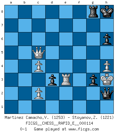 Last move : 0-1 2013 December 4 18:56:37 [Event "FICGS__CHESS__RAPID_E__000114"] [Site "FICGS"] [Date "2013.09.30"] [Round "1"] [White "Martinez Camacho,Victor Hugo"] [Black "Stoyanov,Zdravko"] [Result "0-1"] [WhiteElo "1253"] [BlackElo "1221"] 1.e4 c5 2.f4 a6 3.Nf3 h6 4.Bc4 Nc6 5.a4 e6 6.O-O Qa5 7.d3 Be7 8.Bd2 Qc7 9.Qe1 Nf6 10.Be3 Na5 11.Ba2 O-O 12.Nbd2 d6 13.Nc4 Nxc4 14.Bxc4 d5 15.exd5 Nxd5 16.Bxd5 exd5 17.Ne5 Be6 18.Qg3 Bf5 19.Qf3 d4 20.Bf2 b6 21.Rae1 Bd6 22.g4 Bd7 23.Nxd7 Qxd7 24.Re4 f5 25.gxf5 Qxf5 26.Bg3 Qg6 27.Kh1 b5 28.b3 Rae8 29.Rfe1 Rc8 30.Re6 Rf6 31.Rxf6 gxf6 32.Rg1 Kh7 33.Bh4 Qf7 34.Qe4+ f5 35.Qf3 bxa4 36.bxa4 Rg8 37.Bg3 Qa2 38.Qb7+ Kh8 39.Qxa6 Qd5+ 40.Rg2 Bxf4 41.Qf6+ Kh7 42.Qe7+ Rg7 43.Qh4 Rg4 44.Qe7+ Rg7 45.Qh4 Be5 46.Kg1 f4 47.Qh5 fxg3 48.Qf5+ Rg6 49.h4 Kg7 50.a5 c4 51.dxc4 Qd6 52.Re2 Bf4 53.a6 Be3+ 54.Kg2 Qc6+ 55.Qf3 Qxa6 56.Qd5 Qf6 57.Qb7+ Kh8 58.Qc8+ Rg8 59.Qc5 d3 60.Rxe3 Qf2+ 61.Kh3 Qh2+ 0-1 Sicilian : Grand Prix attack Kingside Castling by player White (move 6) Kingside Castling by player Black (move 11) Player Black won this chess game. Follow this game move after move (download)Blessed be the memory of him who gave the world this immortal game. (A. G. Gardiner) Die FIDE ist dabei in die Hände der russischen Mafia zu fallen. (Larry Evans) El Ajedrez es un terrible juego. Si no controlas el centro, tu oponente tiene una posición mas holgada. Si tienes control del centro, ¡entonces realmente tu tienes algo de que preocuparte!. (Siegbert Tarrasch) RxDa4 pat (...) He who fights with monsters should be careful lest he thereby become a monster. (Friedrich Nietzsche, Beyond Good and Evil)