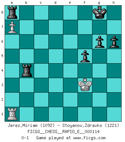 Last move : 0-1 2014 February 8 0:49:23 [Event "FICGS__CHESS__RAPID_E__000114"] [Site "FICGS"] [Date "2013.09.30"] [Round "1"] [White "Jerez,Miriam"] [Black "Stoyanov,Zdravko"] [Result "0-1"] [WhiteElo "1092"] [BlackElo "1221"] 1.e4 c5 2.d4 cxd4 3.Qxd4 a6 4.Nf3 Nc6 5.Qd2 e5 6.Nc3 Bb4 7.a3 Ba5 8.b4 Bb6 9.Bc4 Nf6 10.O-O O-O 11.h3 Nh5 12.g4 Nf4 13.h4 d6 14.Bb2 Bxf2+ 15.Kxf2 Bxg4 16.Rg1 Bxf3 17.Kxf3 Nd4+ 18.Kg3 Ng6 19.Nd5 Qxh4+ 20.Kg2 Nf4+ 21.Kf1 Qh3+ 22.Kf2 Qh2+ 23.Ke3 Qxd2+ 24.Kxd2 Nf3+ 25.Ke3 Nxg1 26.Rxg1 b5 27.Bb3 Nxd5+ 28.Bxd5 Rac8 29.c3 Kh8 30.Bb7 Rb8 31.Bxa6 Rb6 32.Bxb5 Rxb5 33.Bc1 Kg8 34.Kd3 d5 35.exd5 Rxd5+ 36.Ke4 Rfd8 37.Bh6 g6 38.c4 Rd4+ 39.Kxe5 Rxc4 40.Bg5 Rdc8 41.Kd5 Rc3 42.a4 Rb3 43.Bd2 Rd3+ 44.Ke4 Rxd2 45.Ra1 Re8+ 46.Kf3 Rd3+ 47.Kf2 f5 48.a5 Rb3 49.a6 Rxb4 50.a7 Ra8 51.Kf3 h6 0-1 This chess game has been lost on time (started : 2013.09.30 21:13:42) Sicilian : Smith-Morra gambit Kingside Castling by player White (move 10) Kingside Castling by player Black (move 10) 10 pieces endgame at move 44 : White KRPP , Black KRRPPP WHITE : King + 1 Rook 2 Pawns BLACK : King + 2 Rooks 3 Pawns 9 pieces endgame at move 49 : White KRP , Black KRRPPP WHITE : King + 1 Rook 1 Pawn BLACK : King + 2 Rooks 3 Pawns Player Black won this chess game. Follow this game move after move (download)The essence of Chess is thinking about what Chess is. (David Bronstein) Ich könnte leicht behaupten: Ja,ja, Leonid Breschnew wollte nicht, daß ich Weltmeister werde. In der Tat war die Sache komplizierter. (Viktor Kortschnoi) El Ajedrez no es como la vida... ¡tiene reglas!. (Mark Pasternak) La vie et les Echecs sont tous les deux une lutte constante. (Lasker) Internet: Absolute communication, absolute isolation. (Paul Carvel)