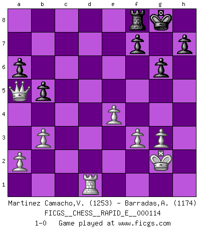 Last move : 1-0 2013 November 6 12:42:19 [Event "FICGS__CHESS__RAPID_E__000114"] [Site "FICGS"] [Date "2013.09.30"] [Round "1"] [White "Martinez Camacho,Victor Hugo"] [Black "Barradas,Anderson"] [Result "1-0"] [WhiteElo "1253"] [BlackElo "1174"] 1.e4 c5 2.Nc3 e6 3.f4 d6 4.Nf3 Nc6 5.Bb5 Bd7 6.O-O a6 7.Bxc6 Bxc6 8.d3 e5 9.Bd2 Nf6 10.Be3 exf4 11.Bxf4 Nh5 12.Be3 Be7 13.Nd2 Nf6 14.Qe1 O-O 15.Ne2 Ng4 16.Bf2 Bf6 17.c3 Ne5 18.d4 cxd4 19.Nxd4 Qd7 20.Nxc6 Nxc6 21.Rd1 Ne5 22.Nf3 Nxf3+ 23.gxf3 Be5 24.Bg3 Qc7 25.Qf2 b5 26.Rd5 Bxg3 27.hxg3 Rae8 28.Rfd1 Rd8 29.Kg2 g6 30.Qd2 Qc4 31.b3 Qc6 32.Rxd6 Rxd6 33.Qxd6 Qxc3 34.Qd2 Qa5 35.Qxa5 1-0 Sicilian : Closed Kingside Castling by player White (move 6) Kingside Castling by player Black (move 14) Player White won this chess game. Follow this game move after move (download)In Chess, at least, the brave inherit the earth. (Edmar Mednis) Im Hotelzimmer gab es nur zwei Schaben. (Über die Turnierbedingungen) (Peter Swidler) Todos los Maestros de Ajedrez fueron un día unos principiantes. (Chernev) Les Echecs ne sont pas pour les âmes timides. Ils requièrent un homme entier, qui ne s'arrête pas aveuglément à ce qui a été déjà établi, mais qui tente individuellement de sonder les profondeurs du jeu. (W. Steinitz) Wisdom doesn't necessarily come with age. Sometimes age just shows up all by itself. (Tom Watson)