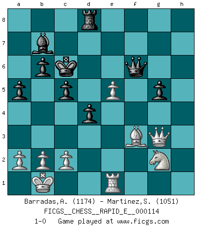 Last move : 1-0 2013 December 30 22:10:50 [Event "FICGS__CHESS__RAPID_E__000114"] [Site "FICGS"] [Date "2013.09.30"] [Round "1"] [White "Barradas,Anderson"] [Black "Martinez,Silvio"] [Result "1-0"] [WhiteElo "1174"] [BlackElo "1051"] 1.e4 e5 2.Nf3 Nc6 3.d4 exd4 4.Nxd4 Nxd4 5.Qxd4 d6 6.Nc3 Nf6 7.Bg5 Be7 8.Qd3 O-O 9.Bxf6 Bxf6 10.Be2 b6 11.Bf3 Bb7 12.O-O-O a5 13.Nd5 Rc8 14.h4 Re8 15.g4 c6 16.Nf4 h6 17.Ng2 c5 18.Qe3 d5 19.g5 d4 20.Qf4 Be5 21.Qg4 hxg5 22.hxg5 g6 23.Qh3 Qxg5+ 24.Kb1 Kf8 25.Bg4 Rcd8 26.Rhf1 Ke7 27.f4 Bxf4 28.Rxf4 Kd6 29.Qg3 Kc6 30.Re1 Re6 31.Rxf7 Rf6 32.Rxf6+ Qxf6 33.Bf3 g5 34.e5 1-0 This chess game has been lost on time (started : 2013.09.30 21:13:42) Scotch game Kingside Castling by player Black (move 8) Queenside Castling by player White (move 12) Player White won this chess game. Follow this game move after move (download)All that matters on the Chessboard is good moves. (Bobby Fischer) Später, ... hatte ich zunehmend Erfolg in entscheidenden Partien. Vielleicht weil ich eine einfache Wahrheit erkannte: nicht nur ich hatte Angst, auch mein Gegner. (Mikhail Nekhemyevich Tal) a manera como él juega al Ajedrez, demuestra la completa naturaleza de un hombre. (Stanley Ellin) Horreur, mais aussi harmonie suprême : qu'y avait-il en effet au monde en dehors des échecs ? Le brouillard, l'inconnu, le non-être... (Vladimir Nabokov) True nature is revealed in times of difficulty. (Chinese proverb)