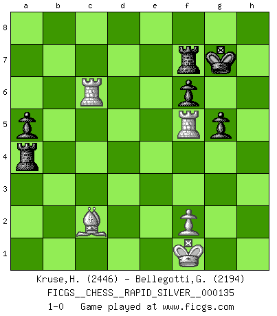 Last move : 1-0 2014 January 2 4:31:45 [Event "FICGS__CHESS__RAPID_SILVER__000135"] [Site "FICGS"] [Date "2013.10.03"] [Round "1"] [White "Kruse,Herbert"] [Black "Bellegotti,Giorgio"] [Result "1-0"] [WhiteElo "2446"] [BlackElo "2194"] 1.Nf3 d5 2.g3 Nf6 3.Bg2 c6 4.O-O Bg4 5.c4 e6 6.Qb3 Qb6 7.h3 Bxf3 8.Bxf3 Bc5 9.e3 Nbd7 10.d4 Be7 11.Nc3 O-O 12.Rd1 Rfd8 13.Kg2 h6 14.Bd2 Qc7 15.Be2 a6 16.Rac1 dxc4 17.Qxc4 Rac8 18.a4 e5 19.Qb3 exd4 20.exd4 Bd6 21.a5 Re8 22.Bf3 Rb8 23.h4 Qd8 24.Qc4 Rc8 25.Na4 Ne4 26.Be1 Nef6 27.Bc3 Qc7 28.Qd3 Qb8 29.Qf5 Re6 30.b4 Rd8 31.h5 R6e8 32.Rd3 Qc7 33.Bd2 Qc8 34.Nc5 Bxc5 35.bxc5 Nb6 36.Qxc8 Nxc8 37.Rb3 Re7 38.Rcb1 Rxd4 39.Bf4 R4d7 40.Kf1 Kf8 41.Bg2 Nxh5 42.Bh3 Rd5 43.Bxc8 Nxf4 44.gxf4 Rxc5 45.Bxb7 Rxa5 46.Bxc6 g5 47.fxg5 hxg5 48.Bf3 Kg7 49.Rb6 Ra4 50.Bb7 a5 51.R1b5 f6 52.Ba6 Kg6 53.Rd5 Kg7 54.Rf5 Rf7 55.Rc6 Kg6 56.Bd3 Kg7 57.Bc2 1-0 Reti : King's Indian attack, Yugoslav variation Kingside Castling by player White (move 4) Kingside Castling by player Black (move 11) Player White won this chess game. Follow this game move after move (download)Chess is 99 percent tactics. (Teichmann) Ich verlor meine Bürgerrechte, mein Gehalt wurde mir nicht mehr bezahlt und ich wurde zensiert und durfte nicht mehr ins Ausland reisen. [nach dem Match Fischer-Taimanov 6:0] (Mark Taimanov) A la fecha, Fischer esta simplemente un nivel arriba de todos los mejores jugadores de Ajedrez del mundo. (John Jacobs) La vie est comme un jeu d'échecs : nous esquissons un plan, mais celui-ci est tributaire de ce que daignent faire l'adversaire aux échecs et le destin dans la vie. (Arthur Schopenhauer) To be champion requires more than simply being a strong player; one has to be a strong human being as well. (Anatoly Karpov)