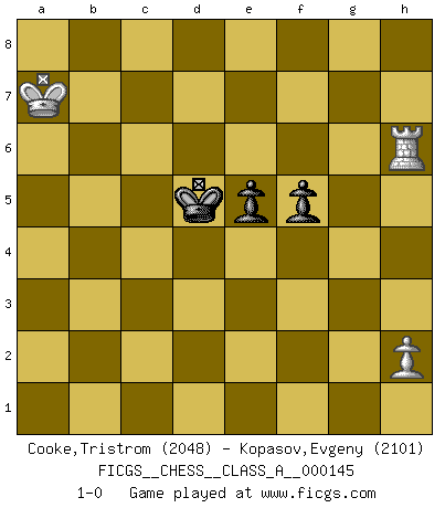 Last move : 1-0 2014 June 16 14:42:58 [Event "FICGS__CHESS__CLASS_A__000145"] [Site "FICGS"] [Date "2013.10.03"] [Round "1"] [White "Cooke,Tristrom"] [Black "Kopasov,Evgeny"] [Result "1-0"] [WhiteElo "2048"] [BlackElo "2101"] 1.e4 c5 2.Bc4 e6 3.Nf3 d6 4.d4 cxd4 5.Nxd4 Nf6 6.Nc3 a6 7.O-O b5 8.Bd3 Bb7 9.Re1 Be7 10.a4 b4 11.Na2 a5 12.Bb5+ Nbd7 13.Nc6 Bxc6 14.Bxc6 Rc8 15.Bb5 O-O 16.c3 bxc3 17.Nxc3 Nc5 18.Bf4 Qb6 19.Qe2 Rfd8 20.Rad1 h6 21.Rd2 Qc7 22.Qf3 Qb7 23.R2d1 Ne8 24.Qg3 Kh8 25.Be3 Nf6 26.Bd4 Nh5 27.Qg4 Nf6 28.Qe2 Nh7 29.Nb1 Bf6 30.Bxc5 Rxc5 31.Nd2 Qa7 32.Nb3 Rc7 33.g3 Kg8 34.Kg2 Be7 35.Rc1 Rxc1 36.Rxc1 d5 37.Rc6 Bb4 38.exd5 Rxd5 39.Rc8+ Nf8 40.Bc6 Rd6 41.Qb5 Be1 42.Qc5 Qxc5 43.Nxc5 Bb4 44.Bb5 Rd2 45.Nd3 Be7 46.Kf3 g5 47.Ke3 Rd1 48.Ra8 Bf6 49.Bc4 Kg7 50.Rxa5 Ng6 51.b4 Ne7 52.Ra7 Nf5+ 53.Ke2 Ra1 54.a5 Kf8 55.Rc7 Nd6 56.f4 Bd4 57.Ne1 Rc1 58.Nc2 Rxc2+ 59.Kd3 Rb2 60.Kxd4 Rxb4 61.Kc5 Rxc4+ 62.Kxd6 Ra4 63.Rc5 gxf4 64.gxf4 Rxf4 65.Kc7 Ke7 66.a6 Ra4 67.Kb6 Kd6 68.Rb5 f5 69.a7 Rxa7 70.Kxa7 e5 71.Rb6+ Kd5 72.Rxh6 1-0 Sicilian defense Kingside Castling by player White (move 7) Kingside Castling by player Black (move 15) 10 pieces endgame at move 64 : White KRPPP , Black KRPPP WHITE : King + 1 Rook 3 Pawns BLACK : King + 1 Rook 3 Pawns 9 pieces endgame at move 64 : White KRPP , Black KRPPP WHITE : King + 1 Rook 2 Pawns BLACK : King + 1 Rook 3 Pawns 8 pieces endgame at move 69 : White KRP , Black KRPPP WHITE : King + 1 Rook 1 Pawn BLACK : King + 1 Rook 3 Pawns 7 pieces endgame at move 70 : White KRP , Black KPPP WHITE : King + 1 Rook 1 Pawn BLACK : King + 3 Pawns 6 pieces endgame at move 72 : White KRP , Black KPP WHITE : King + 1 Rook 1 Pawn BLACK : King + 2 Pawns Player White won this chess game. Follow this game move after move (download)The older I grow, the more I value Pawns. (Keres) Die jungen Leute sollen verstehen, dass sie noch etwas von mir lernen können und müssen. (Viktor Kortschnoi) El jugador de combinación piensa hacia adelante; comienza de la posición dada y trabaja las movidas contundentes en su mente. (Emanuel Lasker) Vous n'êtes pas toujours obligé de jouer le meilleur coup. Un coup doit être actif, entreprenant, correct et beau ! (David Bronstein) Pretend inferiority and encourage his arrogance. (Sun Tzu)