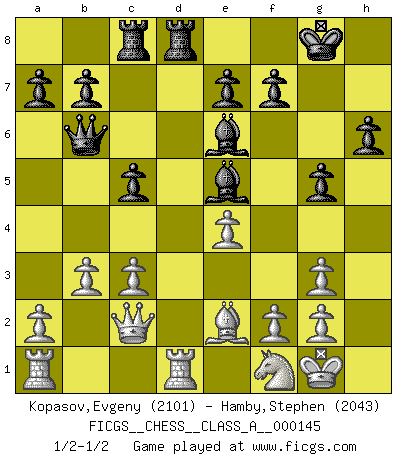 Last move : 1/2-1/2 2014 April 3 16:31:55 [Event "FICGS__CHESS__CLASS_A__000145"] [Site "FICGS"] [Date "2013.10.03"] [Round "1"] [White "Kopasov,Evgeny"] [Black "Hamby,Stephen"] [Result "1/2-1/2"] [WhiteElo "2101"] [BlackElo "2043"] 1.d4 Nf6 2.Nf3 g6 3.Bg5 Bg7 4.Nbd2 O-O 5.c3 d6 6.e4 c5 7.dxc5 dxc5 8.Bc4 Nc6 9.Qe2 Qc7 10.O-O Na5 11.Bd3 h6 12.Bh4 Nh5 13.Qe3 Rd8 14.Rfd1 Be6 15.Nf1 g5 16.Bg3 Qb6 17.Qc1 Nxg3 18.hxg3 Nc4 19.b3 Ne5 20.Nxe5 Bxe5 21.Qc2 Rac8 22.Be2 1/2-1/2 King's Indian : Torre attack Kingside Castling by player Black (move 4) Kingside Castling by player White (move 10) This chess game ended in a draw. Follow this game move after move (download)I'm not afraid of Spassky. The world knows I'm the best. You don't need a match to prove it. (Bobby Fischer) Ich kämpfe solange mein Gegner einen Fehler machen kann. (Emanuel Lasker) El Ajedrez es realmente noventa y nueve por ciento calculación. (Soltis) La vie et les Echecs sont tous les deux une lutte constante. (Lasker) That's absurd. I love it. (Gregory House, House M.D.)