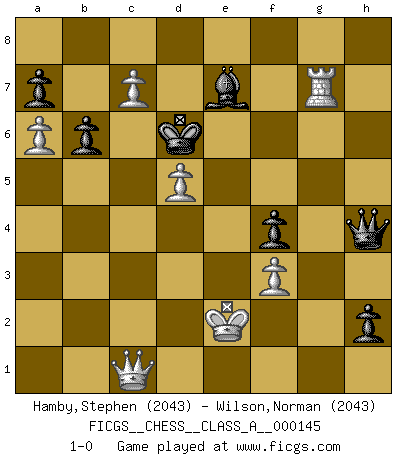 Last move : 1-0 2014 March 13 15:52:56 [Event "FICGS__CHESS__CLASS_A__000145"] [Site "FICGS"] [Date "2013.10.03"] [Round "1"] [White "Hamby,Stephen"] [Black "Wilson,Norman"] [Result "1-0"] [WhiteElo "2043"] [BlackElo "2043"] 1.c4 e5 2.g3 Nc6 3.Nc3 g6 4.Bg2 Bg7 5.e4 d6 6.Nge2 h5 7.h4 Bg4 8.f3 Be6 9.d3 Qd7 10.Nd5 O-O-O 11.b4 Nce7 12.Be3 Kb8 13.b5 Bh6 14.Bf2 f5 15.Qa4 Nc8 16.Qb3 fxe4 17.dxe4 Qf7 18.a4 g5 19.hxg5 Bxg5 20.a5 Nf6 21.Nec3 Bxd5 22.Nxd5 Nxd5 23.cxd5 Rdf8 24.Qc2 Qd7 25.Qc4 Rh6 26.Ke2 Qf7 27.a6 c5 28.bxc6 b6 29.Rab1 Bd8 30.Qc3 Bc7 31.Rh2 Ne7 32.Rbh1 Rh7 33.Bh3 Rfh8 34.Be6 Qg7 35.Qc1 Qf6 36.Rh3 h4 37.g4 Ng6 38.Be3 Nf4+ 39.Bxf4 exf4 40.Bf5 Bd8 41.Bxh7 Rxh7 42.g5 Qxg5 43.Rg1 Qh6 44.Rh2 Kc7 45.Rhg2 h3 46.Rg6 Qh4 47.Rg7+ Rxg7 48.Rxg7+ Be7 49.e5 h2 50.exd6+ Kxd6 51.c7 1-0 English Opening Queenside Castling by player Black (move 10) Player White won this chess game. Follow this game move after move (download)No price is too great for the scalp of the enemy King. (Koblentz) Bogoljubow: Matt in vier Zügen! Tartakower: Ich verbitte mir jede Belästigung! (Savielly Grigorievitsch Tartakower) Muchos se han convertido en Maestros de Ajedrez, nadie se ha convertido en el Maestro del Ajedrez. (Siegbert Tarrasch) Je fais ceci parce que dans cinquante coups j'obtiendrai cela; je m'appelle Mikhail Moisevitch Botvinnik. (Botvinnik) Whatever you do, don't be bored. This is absolutely the most exciting time we could have possibly hoped to be alive. And things are just starting. (From movie Waking life)