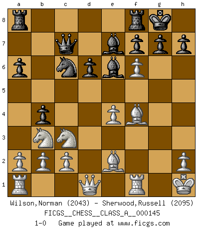 Last move : 1-0 2013 October 8 19:25:47 [Event "FICGS__CHESS__CLASS_A__000145"] [Site "FICGS"] [Date "2013.10.03"] [Round "1"] [White "Wilson,Norman"] [Black "Sherwood,Russell"] [Result "1-0"] [WhiteElo "2043"] [BlackElo "2095"] 1.e4 c5 2.Nc3 d6 3.Nge2 Nf6 4.d4 cxd4 5.Nxd4 a6 6.Be2 e5 7.Nb3 Be7 8.O-O O-O 9.Kh1 Be6 10.f4 b5 11.Be3 Qc7 12.g4 exf4 13.Bxf4 Nc6 14.g5 b4 15.gxf6 1-0 Sicilian : Closed Kingside Castling by player White (move 8) Kingside Castling by player Black (move 8) Player White won this chess game. Follow this game move after move (download)I have added these principles to the law: get the Knights into action before both Bishops are developed. (Emanuel Lasker) Als ich elf wurde, wurde ich einfach gut. (Robert James Fischer) El Ajedrez, como la música, como el amor, tiene el poder de hacer feliz a la gente. (Siegbert Tarrasch) Comme les marins qui ont mille raisons différentes d'aller en mer, les joueurs d'échecs en ont tout autant avant de s'installer devant une table et jouer... (Vincent Bertignac, philosophe) When you have everything, sometimes it feels like nothing. (Horatio Caine, C.S.I. Miami)