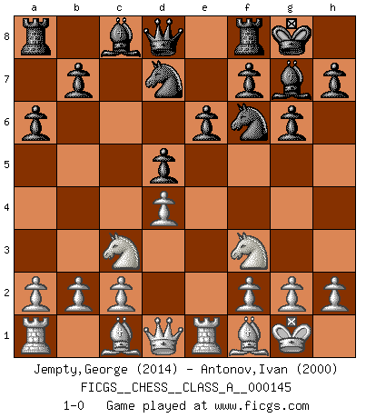 Last move : 1-0 2014 March 2 14:32:20 [Event "FICGS__CHESS__CLASS_A__000145"] [Site "FICGS"] [Date "2013.10.03"] [Round "1"] [White "Jempty,George"] [Black "Antonov,Ivan"] [Result "1-0"] [WhiteElo "2014"] [BlackElo "2000"] 1.e4 c6 2.Nf3 d5 3.exd5 cxd5 4.Ne5 Nf6 5.d4 g6 6.Bb5+ Nbd7 7.O-O Bg7 8.Nc3 O-O 9.Re1 a6 10.Bf1 e6 11.Nf3 1-0 Caro-Kann defense Kingside Castling by player White (move 7) Kingside Castling by player Black (move 8) Player White won this chess game. Follow this game move after move (download)Chess is a terrible game. If you have no center, your opponent has a freer position. If you do have a center, then you really have something to worry about ! (Siegbert Tarrasch) Ein Isolani verdüstert die Stimmung auf dem ganzen Schachbrett. (Savielly Grigorievitsch Tartakower) Preferería tener un Peón que un dedo. (Reuben Fine) Tout change constamment, y compris dans le monde des Echecs. (Botvinnik) The good fighters of old first put themselves beyond the possibility of defeat, and then waited for an opportunity of defeating the enemy. (Sun Tzu)