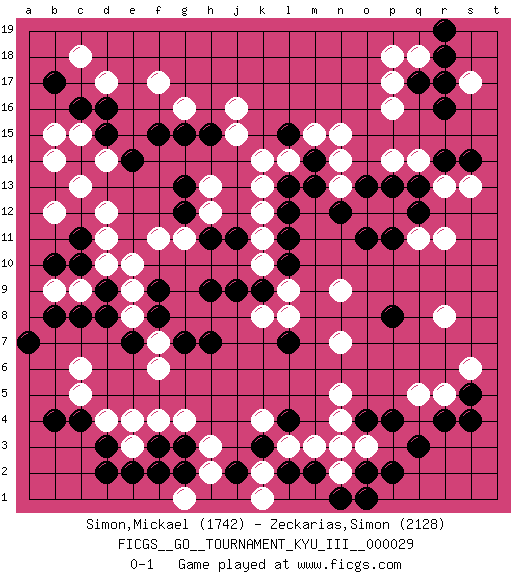 Last move : 0-1 2013 December 22 18:7:25 [Event "FICGS__GO__TOURNAMENT_KYU_III__000029 "] [Site "FICGS"] [Date "2013.10.03"] [Round "1"] [Black "Simon,Mickael "] [White "Zeckarias,Simon "] [Result "0-1"] [Rating 1 "1742"] [Rating 2 "2128"] 1.r16 d17 2.q3 d4 3.d15 r5 4.p4 p16 5.f3 c6 6.d2 d12 7.f15 f17 8.h15 g16 9.g15 j16 10.d9 f6 11.f9 c15 12.c14 b14 13.c16 b15 14.d16 d14 15.e14 c13 16.b17 q14 17.q17 p17 18.s14 h3 19.k3 e3 20.e2 f4 21.g3 g4 22.c4 c5 23.d3 e4 24.b4 r8 25.h9 j15 26.g13 m3 27.l4 n5 28.l7 n7 29.r4 q5 30.o2 o3 31.p2 n2 32.o4 n4 33.s5 s6 34.s4 h2 35.g2 s13 36.r14 r13 37.q13 p14 38.q12 r11 39.o13 q18 40.r18 p18 41.r19 n14 42.o11 q11 43.p11 g1 44.f2 k2 45.l2 l3 46.j2 k4 47.m2 k1 48.n1 n3 49.o1 n13 50.n12 k13 51.p8 s17 52.r17 n9 53.l11 c9 54.c10 d10 55.c11 d11 56.c8 b9 57.b8 e9 58.d8 e8 59.e7 f7 60.f8 e10 61.b10 b12 62.a7 k10 63.l10 l9 64.k9 k8 65.j9 l8 66.h7 k11 67.l12 k12 68.l13 k14 69.m14 n15 70.l15 l14 71.m13 m15 72.p13 g11 73.h11 h12 74.g12 f11 75.j11 h13 76.g7 c18 0-1 Here are the names of the openings (joseki) played in the four corners : Corner d16 : d17 d15Komoku (Somok, Xiao~mu`) 3-4 Point. The komoku (3-4) point is the traditional corner enclosure move..Ikken Takagakari (Hankan Nop'dakeolch'im, Yi Gaogua`jiao~, 1-Space High Approach). The 5-4 approach move has become more popular in modern times, as modern Go emphasizes speed and influence. Corner q4 : q3 r5Komoku (Somok, Xiao~mu`) 3-4 Point. The komoku (3-4) point is the traditional corner enclosure move..Ikken Kakari (Hankan Keolch'im, Yi Gua`jiao~, 1-Space Low Pincer). The small knight move is the basic approach move to the 3-4 point stone. It has been continually used for over four centuries. There are limitless variations, with new moves constantly being discovered. White 2 opens the door to a treaure store of joseki. Corner q16 : r16 p16Komoku (Somok, Xiao~mu`) 3-4 Point. The komoku (3-4) point is the traditional corner enclosure move..Ikken Takagakari (Hankan Nop'dakeolch'im, Yi Gaogua`jiao~, 1-Space High Approach). The 5-4 approach move has become more popular in modern times, as modern Go emphasizes speed and influence. Corner d4 : d4 f3Hoshi (Hwajeom, Seongjeom, Xingwei`) 4-4 Point. The star or hoshi (4-4) point, emphasizing influence at the potential expense of territory.Ikken Kakari (Hankan Keolch'im, Yi Gua`jiao~, 1-Space Low Approach). Black 2 is the standard approach move to the 4-4. Player White won this Go (weiqi, baduk) game.Follow this game move after move (download ) On the third line, four die, six live. (Anonymous) Memory is a complicated thing, a relative to truth, but not its twin. (Barbara Kingsolver, Animal Dreams)