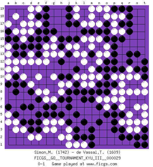 Last move : 0-1 2014 August 27 16:33:45 [Event "FICGS__GO__TOURNAMENT_KYU_III__000029"] [Site "FICGS"] [Date "2013.10.03"] [Round "1"] [Black "Simon,Mickael"] [White "de Vassal,Thibault"] [Result "0-1"] [Rating 1 "1742"] [Rating 2 "1609"] 1.r16 d16 2.q3 c3 3.e4 d5 4.e5 r5 5.p4 q7 6.k3 e2 7.d3 d2 8.d6 c5 9.c6 p17 10.q15 r11 11.q17 p16 12.r13 l17 13.c14 c10 14.f17 c17 15.e15 c15 16.d14 e10 17.j17 k18 18.j18 l15 19.j15 s12 20.s13 g10 21.c4 b4 22.b5 b3 23.d4 g3 24.k5 o14 25.p12 s3 26.r2 o6 27.n4 p10 28.j10 f12 29.h12 b12 30.b15 b16 31.d15 c16 32.b14 e17 33.e18 d18 34.e16 d17 35.f18 b18 36.b8 d12 37.g5 h2 38.o8 p8 39.o10 l12 40.s2 r3 41.n18 o18 42.l18 m18 43.l19 k19 44.k17 m19 45.p9 q9 46.o9 o7 47.q11 q10 48.p11 q4 49.p3 m6 50.k8 l1 51.l2 k1 52.m1 j2 53.k2 j1 54.m2 f8 55.t12 t11 56.r12 s10 57.s11 r10 58.t10 t9 59.t11 s8 60.s5 r4 61.p5 n12 62.t3 t4 63.r6 s6 64.q5 t2 65.p6 p7 66.s7 q6 67.r7 t6 68.b10 b11 69.c9 d9 70.d8 e8 71.e7 f7 72.f6 q18 73.r18 f14 74.f15 g14 75.q19 p18 76.j19 l9 77.l8 m9 78.m8 o11 79.n8 k6 80.j6 k7 81.j7 l5 82.l4 m4 83.m3 m5 84.m7 l6 85.n6 n5 86.o5 n7 87.l7 j14 88.k15 k14 89.h15 j9 90.k9 k10 91.h10 h9 92.j8 h8 93.k11 l10 94.n11 m11 95.o12 o13 96.h14 h13 97.j13 g13 98.l14 k13 99.l16 m15 100.m16 n17 101.n16 m17 102.o16 n15 103.o15 m14 104.p15 q8 105.n6 q16 106.r17 g15 107.g16 j3 108.j4 h4 109.h5 g4 110.e13 e12 111.m13 l13 112.t7 t5 113.o17 r8 114.p19 n19 115.r19 o19 116.h7 g7 117.g6 n10 118.n9 m10 119.c13 c12 120.p13 a10 121.b9 f4 122.p14 n13 123.e3 f3 124.a9 a11 125.a16 a17 126.a15 d13 127.e14 f13 128.b13 a13 129.q2 a5 130.a6 a4 131.s1 e19 132.t1 s4 133.t3 t8 134.f19 d19 135.f5 a12 136.o11 a14 137.f16 pass 138.t2 pass 0-1 Here are the names of the openings (joseki) played in the four corners : Corner d4 : c3 e4 San-San (Sam-Sam, San-San) 3-3 Point. The San-San (3-3) point, emphasizing territory at the expense of influence. Ikken Takagakari (Hankan Nop'dakeolch'im, Yi Gaokeolch'im, 1-Space High Approach). Black 2 is a high tight attack with a direction bias. Black continues with 4-5. Tactically, any other response is less advantageous. Corner q4 : q3 r5 Komoku (Somok, Xiao~mu`) 3-4 Point. The komoku (3-4) point is the traditional corner enclosure move.. Ikken Kakari (Hankan Keolch'im, Yi Gua`jiao~, 1-Space Low Pincer). The small knight move is the basic approach move to the 3-4 point stone. It has been continually used for over four centuries. There are limitless variations, with new moves constantly being discovered. White 2 opens the door to a treaure store of joseki. Corner q16 : r16 p17 Komoku (Somok, Xiao~mu`) 3-4 Point. The komoku (3-4) point is the traditional corner enclosure move.. Ikken Kakari (Hankan Keolch'im, Yi Gua`jiao~, 1-Space Low Pincer). The small knight move is the basic approach move to the 3-4 point stone. It has been continually used for over four centuries. There are limitless variations, with new moves constantly being discovered. White 2 opens the door to a treaure store of joseki. Corner d16 : d16 c14 Hoshi (Hwajeom, Seongjeom, Xingwei`) 4-4 Point. The star or hoshi (4-4) point, emphasizing influence at the potential expense of territory. Ikken Kakari (Hankan Keolch'im, Yi Gua`jiao~, 1-Space Low Approach). Black 2 is the standard approach move to the 4-4. Player White won this Go (weiqi, baduk) game. Follow this game move after move (download)Add one stone, then sacrifice both. (Anonymous) If you ain't just a little scared when you enter a casino, you are either very rich or you haven't studied the games enough. (Pappy)