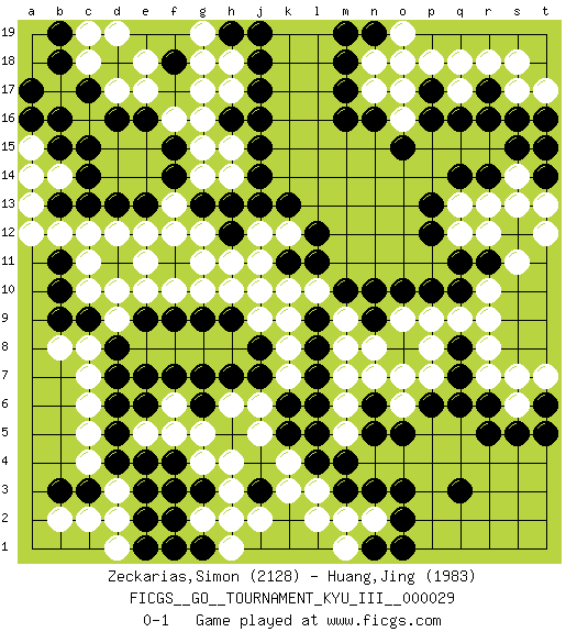 Last move : 0-1 2014 April 19 20:26:42 [Event "FICGS__GO__TOURNAMENT_KYU_III__000029"] [Site "FICGS"] [Date "2013.10.03"] [Round "1"] [Black "Zeckarias,Simon"] [White "Huang,Jing"] [Result "0-1"] [Rating 1 "2128"] [Rating 2 "1983"] 1.r16 c4 2.q3 d17 3.c15 d12 4.f15 g17 5.p17 r10 6.r5 r13 7.e4 h4 8.d8 c6 9.d5 c5 10.e7 c10 11.l4 f5 12.d6 b8 13.b9 c8 14.c9 d9 15.c3 d3 16.d4 c2 17.b3 b2 18.e3 d2 19.b10 c11 20.e9 d10 21.b11 b12 22.c13 c12 23.b13 a12 24.c17 c18 25.d16 e17 26.g3 k4 27.l5 j6 28.j3 k3 29.k6 h3 30.j7 h6 31.h7 l3 32.m3 m2 33.n3 n2 34.o3 r7 35.q10 r9 36.j17 h17 37.j16 o17 38.m17 q17 39.q16 p18 40.p16 r18 41.r17 q18 42.r11 s11 43.s12 r12 44.q11 s13 45.p13 n17 46.m16 p8 47.m18 s17 48.s16 t17 49.o10 g11 50.b18 b17 51.b16 c16 52.t16 s18 53.c17 g15 54.a17 g14 55.j13 j11 56.k11 k10 57.l11 j12 58.k13 j9 59.g13 f13 60.h12 f10 61.f14 f16 62.e13 d19 63.f18 e18 64.g9 g10 65.h9 h10 66.l8 s6 67.s5 o6 68.o2 g2 69.f2 g4 70.f3 j2 71.h16 g16 72.j18 g18 73.t6 t7 74.t5 q9 75.q14 l10 76.m10 f12 77.b19 c19 78.h19 g19 79.g1 h2 80.r6 s7 81.k5 j5 82.p6 o7 83.o5 m9 84.n10 m8 85.f9 k8 86.l7 k7 87.j8 k9 88.l9 j10 89.g7 c7 90.d7 m7 91.l6 m6 92.n5 f6 93.f7 m5 94.m4 a13 95.d13 g12 96.h13 e12 97.e16 b14 98.c14 e11 99.r14 k12 100.l12 s14 101.n1 l2 102.q7 p7 103.q8 r8 104.q6 o9 105.e1 d1 106.s15 n18 107.n19 o19 108.m19 h15 109.j15 h14 110.g6 g5 111.n9 n8 112.p10 p9 113.n6 n7 114.j14 o16 115.o15 q12 116.n16 o18 117.p12 m1 118.o1 h18 119.t14 t12 120.j19 h1 121.f1 a15 122.a16 t13 123.t15 a14 124.b15 q13 125.e6 e5 126.f4 e10 127.e2 h11 0-1 Here are the names of the openings (joseki) played in the four corners : Corner d16 : d17 c15 Komoku (Somok, Xiao~mu`) 3-4 Point. The komoku (3-4) point is the traditional corner enclosure move.. Ikken Kakari (Hankan Keolch'im, Yi Gua`jiao~, 1-Space Low Pincer). The small knight move is the basic approach move to the 3-4 point stone. It has been continually used for over four centuries. There are limitless variations, with new moves constantly being discovered. Black 2 opens the door to a treaure store of joseki. Corner d4 : c4 e4 Komoku (Somok, Xiao~mu`) 3-4 Point. The komoku (3-4) point is the traditional corner enclosure move.. Ikken Takagakari (Hankan Nop'dakeolch'im, Yi Gaogua`jiao~, 1-Space High Approach). The 5-4 approach move has become more popular in modern times, as modern Go emphasizes speed and influence. Player White won this Go (weiqi, baduk) game. Follow this game move after move (download)Corner, side, centre. (Anonymous) Logic : The art of thinking and reasoning in strict accordance with the limitations and incapacities of the human misunderstanding. (Ambrose Bierce)