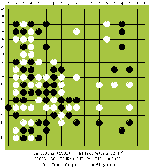 Last move : 1-0 2014 April 19 2:35:45 [Event "FICGS__GO__TOURNAMENT_KYU_III__000029 "] [Site "FICGS"] [Date "2013.10.03"] [Round "1"] [Black "Huang,Jing "] [White "Aahlad,Yeturu "] [Result "1-0"] [Rating 1 "1983"] [Rating 2 "2017"] 1.q16 d4 2.q3 d16 3.f3 c6 4.k4 r6 5.r4 r9 6.r11 p9 7.p11 o17 8.q17 k16 9.c14 c12 10.f17 d14 11.d17 c17 12.c16 c15 13.b16 b15 14.e16 d15 15.b17 e3 16.f4 o15 17.q14 n9 18.n4 f6 19.f14 n6 20.d11 e12 21.d12 d13 22.c11 f10 23.c8 b8 24.b7 b9 25.c7 b11 26.b12 c10 27.d10 c13 28.c9 b10 29.f9 e9 30.e8 f8 31.g9 d9 32.d8 e10 33.f7 g7 34.g8 e7 35.f8 d6 36.h7 g6 37.c3 c4 38.e2 d2 39.d3 b3 40.c2 b2 41.e4 h8 42.j7 h9 43.g10 h10 44.h11 k10 45.b5 b6 46.a6 g12 47.g11 k6 48.j5 j6 49.h6 h5 50.g5 h4 51.k7 1-0 Here are the names of the openings (joseki) played in the four corners : Corner d4 : d4 f3Hoshi (Hwajeom, Seongjeom, Xingwei`) 4-4 Point. The star or hoshi (4-4) point, emphasizing influence at the potential expense of territory.Ikken Kakari (Hankan Keolch'im, Yi Gua`jiao~, 1-Space Low Approach). Black 2 is the standard approach move to the 4-4. Corner q4 : q3 r6Komoku (Somok, Xiao~mu`) 3-4 Point. The komoku (3-4) point is the traditional corner enclosure move..Niken Kakari (Dukan Keolch'im, E`r Gua`jiao~, 2-Space Low Approach). White 2 is used with friendly forces backing it up. Its purpose is to prevent a pincer. Locally it results in a loss, but may be appropriate fuseki strategy. It was popular in the late 1950s and early 1960s, but is not seen often nowadays, having been replaced by the one-space high approach, with which it has points in common. Corner d16 : d16 c14Hoshi (Hwajeom, Seongjeom, Xingwei`) 4-4 Point. The star or hoshi (4-4) point, emphasizing influence at the potential expense of territory.Ikken Kakari (Hankan Keolch'im, Yi Gua`jiao~, 1-Space Low Approach). Black 2 is the standard approach move to the 4-4. Player Black won this Go (weiqi, baduk) game.Follow this game move after move (download ) A basic: Don't push too hard. (Jansteen) The right perception of any matter and a misunderstanding of the same matter do not wholly exclude each other. (Kafka's the trial)