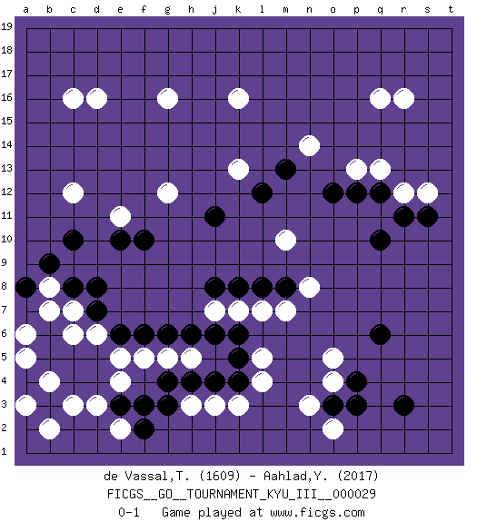 Last move : 0-1 2014 February 26 15:11:24 [Event "FICGS__GO__TOURNAMENT_KYU_III__000029"] [Site "FICGS"] [Date "2013.10.03"] [Round "1"] [Black "de Vassal,Thibault"] [White "Aahlad,Yeturu"] [Result "0-1"] [Rating 1 "1609"] [Rating 2 "2017"] 1.d4 q16 2.r3 d16 3.q10 k3 4.g3 n3 5.q6 k16 6.c10 r12 7.s11 s12 8.r11 c12 9.f10 e11 10.e10 g12 11.q12 q13 12.p12 c3 13.c4 d3 14.e3 e2 15.f2 e4 16.f3 b4 17.b3 b2 18.b5 a3 19.d5 e5 20.e6 f5 21.f6 g5 22.h4 d6 23.c5 c6 24.b6 b7 25.d7 c7 26.d8 h5 27.k4 j3 28.j4 l4 29.k6 h3 30.g4 l5 31.k5 m7 32.k8 p13 33.o12 n14 34.c8 b8 35.b9 a5 36.a8 a6 37.g6 m10 38.j11 g16 39.o3 o4 40.p4 o2 41.p3 o5 42.m8 l7 43.l8 k7 44.j6 j7 45.h6 n8 46.j8 c16 47.m13 k13 48.l12 r16 0-1 Here are the names of the openings (joseki) played in the four corners : Corner q4 : r3 n3 San-San (Sam-Sam, San-San) 3-3 Point. The San-San (3-3) point, emphasizing territory at the expense of influence. Player White won this Go (weiqi, baduk) game. Follow this game move after move (download)Don't disturb symmetry. (Anonymous) Imagination is more important than knowledge. Knowledge is limited. Imagination encircles the world. (Albert Einstein)