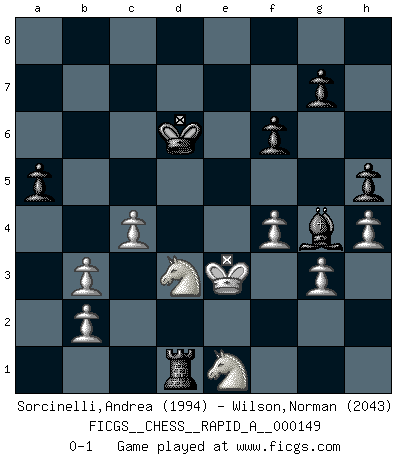 Last move : 0-1 2013 October 19 19:30:32 [Event "FICGS__CHESS__RAPID_A__000149"] [Site "FICGS"] [Date "2013.10.07"] [Round "1"] [White "Sorcinelli,Andrea"] [Black "Wilson,Norman"] [Result "0-1"] [WhiteElo "1994"] [BlackElo "2043"] 1.e4 c5 2.Nf3 d6 3.d4 cxd4 4.Nxd4 Nf6 5.Nc3 a6 6.Bc4 e6 7.Bb3 Nbd7 8.Bg5 Nc5 9.f4 Be7 10.Qf3 O-O 11.O-O Qc7 12.Rae1 Nxb3 13.axb3 Qc5 14.Qf2 Ng4 15.Nxe6 Qxf2+ 16.Rxf2 Bxg5 17.Nxg5 Nxf2 18.Kxf2 b5 19.Rd1 Bb7 20.Rxd6 b4 21.Nd5 Rfd8 22.Rxd8+ Rxd8 23.Nxb4 Rd2+ 24.Kf1 Rd1+ 25.Ke2 Rg1 26.Kf2 Rc1 27.c3 Rb1 28.Nd3 h6 29.Nf3 Bxe4 30.Nfe1 a5 31.Ke3 Bf5 32.Kf3 h5 33.g3 Kf8 34.h4 Rd1 35.Ke2 Bg4+ 36.Ke3 Ke7 37.Nc2 Bf5 38.Nce1 Kd6 39.Ke2 Bg4+ 40.Ke3 f6 41.Nc2 Bf5 42.Nce1 Be6 43.c4 Bg4 0-1 Sicilian : Najdorf, Lipnitzky attack Kingside Castling by player Black (move 10) Kingside Castling by player White (move 11) Player Black won this chess game. Follow this game move after move (download)Chess demands total concentration. (Bobby Fischer) Im Schach gewinnt jeder. Hat man Freunde am Spiel - und das ist die Hauptsache - ist auch der Verlust einer Partie kein Unglück. (David Bronstein) Robert Fischer es la ley hacia si mismo. (Larry Evans) La tactique, c'est ce que vous faites quand il y a quelque chose à faire; la stratégie, c'est ce que vous faites quand il n'y a rien à faire. (Savielli Tartacower) I couldn't make any sense out of what this particular thread is about. It sounds like R2 D2 computer speaking. A space fight ?!? Some 'command' problems in Moscow ? Some killers & narcotic addicts attacking some game & a god wannabe ?? (Dinesh De Silva, lost in a russian conflict in FICGS forum)
