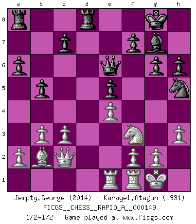 Last move : 1/2-1/2 2013 November 23 2:51:10 [Event "FICGS__CHESS__RAPID_A__000149"] [Site "FICGS"] [Date "2013.10.07"] [Round "1"] [White "Jempty,George"] [Black "Karayel,Atagun"] [Result "1/2-1/2"] [WhiteElo "2014"] [BlackElo "1931"] 1.e4 e5 2.Nf3 Nc6 3.Bb5 a6 4.Ba4 d6 5.c3 g6 6.d4 Bd7 7.O-O Bg7 8.dxe5 Nxe5 9.Nxe5 dxe5 10.Bg5 Nf6 11.Nd2 O-O 12.Nf3 Bxa4 13.Qxa4 Qe8 14.Qc2 Qe6 15.Rad1 Rfd8 16.b3 h6 17.Bc1 b5 18.h3 Qc6 19.Rde1 Qe6 20.Bb2 Nh5 1/2-1/2 Ruy Lopez : Modern Steinitz defense Kingside Castling by player White (move 7) Kingside Castling by player Black (move 11) This chess game ended in a draw. Follow this game move after move (download)Bobby Fischer is the greatest Chess player who has ever lived. (Ken Smith) Ihnen, Herr Lasker, habe ich nur drei Worte zu sagen: Schach und matt. (Siegbert Tarrasch) Coloca el contenido del tablero de Ajedrez en un sombrero, agita las piezas vigorosamente, derrámalas en el tablero desde una altura de medio metro y así obtienes el estilo de Wilhelm Steinitz. (H. E. Bird) Même un GMI sait rarement calculer sur plus de cinq coups une attaque à sacrifices. (Rudolf Spielmann) The worth of a book is to be measured by what you can carry away from it. (James Bryce)