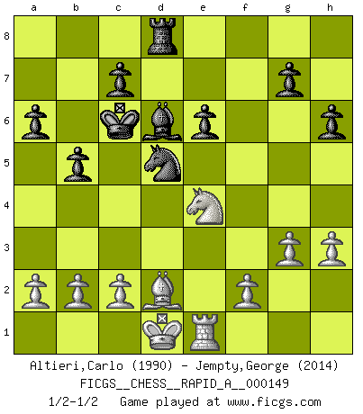 Last move : 1/2-1/2 2013 November 10 19:56:27 [Event "FICGS__CHESS__RAPID_A__000149"] [Site "FICGS"] [Date "2013.10.07"] [Round "1"] [White "Altieri,Carlo"] [Black "Jempty,George"] [Result "1/2-1/2"] [WhiteElo "1990"] [BlackElo "2014"] 1.e4 d5 2.exd5 Qxd5 3.Nf3 Bg4 4.Be2 Nc6 5.d4 O-O-O 6.Be3 e5 7.Nc3 Qa5 8.Nxe5 Bxe2 9.Qxe2 Nxe5 10.dxe5 Qxe5 11.Rd1 Rxd1+ 12.Kxd1 Nf6 13.Qc4 Bd6 14.Kc1 Qe6 15.Qxe6+ fxe6 16.h3 a6 17.Re1 Kd7 18.Kd1 b5 19.Nb1 Nd5 20.Nd2 Kc6 21.Ne4 h6 22.g3 Rd8 23.Bd2 1/2-1/2 Scandinavian (centre counter) defense Queenside Castling by player Black (move 5) This chess game ended in a draw. Follow this game move after move (download)When you absolutely don't know what to do anymore, it is time to panic. (John van der Wiel) Du musst Deinen Gegner in einen tiefen dunklen Wald führen wo 2+2=5 ist und wo der Weg, der wieder hinausführt, nur breit genug für einen ist. (Mikhail Nekhemyevich Tal) El Ajedrez es parte de la cultura, y si una cultura esta en decadencia, entonces también el Ajedrez declinará. (Mikhail Botvinnik) Il n'y a plus de joueurs du niveau de Jacob Murray dont la seule quête est le beau jeu, le plaisir de voir les pièces construire quelque chose. Sur 10 idées à la minute, 9 seront sans intérêt, la dernière s'avèrera géniale. (Christian Bauer) To be champion requires more than simply being a strong player; one has to be a strong human being as well. (Anatoly Karpov)