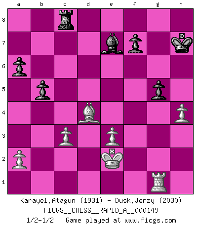 Last move : 1/2-1/2 2014 February 13 0:6:38 [Event "FICGS__CHESS__RAPID_A__000149"] [Site "FICGS"] [Date "2013.10.07"] [Round "1"] [White "Karayel,Atagun"] [Black "Dusk,Jerzy"] [Result "1/2-1/2"] [WhiteElo "1931"] [BlackElo "2030"] 1.d4 Nf6 2.Nf3 d5 3.c4 e6 4.Bg5 Be7 5.e3 h6 6.Bh4 O-O 7.Nbd2 c5 8.dxc5 Na6 9.cxd5 Nxc5 10.dxe6 Bxe6 11.Nd4 Bd5 12.Rc1 Rc8 13.Rc2 a6 14.Bc4 g5 15.Bg3 Bxg2 16.Rg1 Bh3 17.Be5 b5 18.Bf1 Bxf1 19.Kxf1 Qd5 20.f4 Ne6 21.Ke1 Nxd4 22.Bxd4 Qf5 23.fxg5 hxg5 24.Rc3 Ne4 25.Nxe4 Qxe4 26.Qh5 Qh7 27.Qxh7+ Kxh7 28.Ke2 Rxc3 29.bxc3 Rc8 30.h4 1/2-1/2 Queen's pawn game Kingside Castling by player Black (move 6) This chess game ended in a draw. Follow this game move after move (download)Chess is ruthless: you've got to be prepared to kill people. (Nigel Short) Wenn du nicht weißt was du tun sollst, warte bis dein Gegner eine Idee hat. Sie wird sicher schlecht sein. (Siegbert Tarrasch) Los Peones son nacidos libres, y aún así, se encuentran por doquier encadenados. (Rick Kennedy) Les échecs sont un jeu terrible. Si vous n'avez pas le centre, votre adversaire a une position plus libre. Par contre, si vous avez le centre, alors vous avez vraiment quelque chose pour laquelle vous inquiéter ! (Siegbert Tarrasch) There are two types of people in this world, good and bad. The good sleep better, but the bad seem to enjoy the waking hours much more. (Woody Allen)
