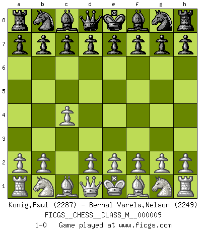 Last move : 1-0 2007 March 24 8:0:33 [Event "FICGS__CHESS__CLASS_M__000009"] [Site "FICGS"] [Date "2007.02.07"] [Round "1"] [White "Konig,Paul"] [Black "Bernal Varela,Nelson"] [Result "1-0"] [WhiteElo "2287"] [BlackElo "2249"] 1.c4 1-0 This chess game has been lost on time (started : 2007.02.07 12:23:43) English Opening Player White won this chess game. Follow this game move after move (download)White lost because he failed to remember the right continuation and had to think up the moves himself. (Siegbert Tarrasch) Es genügt nicht ein guter Spieler zu sein, man muß auch gut spielen. (Siegbert Tarrasch) El Ajedrez es parte de una cultura y si una cultura esta en decadencia, entonces también el Ajedrez declinará. (Mikhail Botvinnik) Les échecs sont un jeu terrible. Si vous n'avez pas le centre, votre adversaire a une position plus libre. Par contre, si vous avez le centre, alors vous avez vraiment quelque chose pour laquelle vous inquiéter ! (Siegbert Tarrasch) If things go wrong, don't go with them. (Roger Babson)