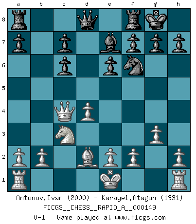 Last move : 0-1 2014 January 22 11:41:10 [Event "FICGS__CHESS__RAPID_A__000149"] [Site "FICGS"] [Date "2013.10.07"] [Round "1"] [White "Antonov,Ivan"] [Black "Karayel,Atagun"] [Result "0-1"] [WhiteElo "2000"] [BlackElo "1931"] 1.d4 d5 2.c4 e6 3.Nf3 Nf6 4.g3 dxc4 5.Bg2 Bb4 6.Bd2 Be7 7.Qc2 Bd7 8.Ne5 Nc6 9.Qxc4 O-O 10.Nc3 Be8 11.Nxc6 Bxc6 12.Bxc6 bxc6 0-1 This chess game has been lost on time (started : 2013.10.07 16:18:49) Queen's gambit declined Kingside Castling by player Black (move 9) Player Black won this chess game. Follow this game move after move (download)We like to think. (Gary Kasparov) Das Schach hält seine Meister in eigenen Banden, Fesseln; auf vielerlei Weise formt es ihren Geist, so dass die innere Freiheit selbst des Stärksten beeinflusst wird. (Albert Einstein) Si pudieramos observar el interior de la cabeza de un jugador de Ajedrez, encontraríamos ahí un mundo lleno de sentimientos, imágenes, ideas, emoción y pasión. (Alfred Binet) Il n'y a pas eu de défaite parce que je ne crois pas que cet ordinateur ait jamais existé. IBM a triché en refusant d'imprimer les modes de recherche de la machine. C'est évident, pendant le match, des coups décisifs ont été joués par des êtres humains. Aujourd'hui, les meilleurs spécialistes en informatique ne peuvent toujours pas expliquer comment Deep-Blue a pu jouer contre la logique des ordinateurs. IBM a gagné une guerre de communication, mais ils sont incapables de prouver que l'ordinateur a gagné tout seul. (Garry Kasparov) Fame, I have already. Now I need the money. (an elderly Steinitz)