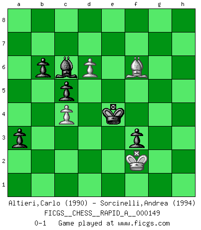 Last move : 0-1 2013 October 9 22:56:5 [Event "FICGS__CHESS__RAPID_A__000149"] [Site "FICGS"] [Date "2013.10.07"] [Round "1"] [White "Altieri,Carlo"] [Black "Sorcinelli,Andrea"] [Result "0-1"] [WhiteElo "1990"] [BlackElo "1994"] 1.d4 Nf6 2.c4 g6 3.f3 d5 4.cxd5 Nxd5 5.e4 Nb6 6.Nc3 Bg7 7.Be3 O-O 8.Qd2 Nc6 9.O-O-O e5 10.d5 Nd4 11.f4 c5 12.fxe5 Bg4 13.Re1 Bxe5 14.h3 Qh4 15.Bd3 Rac8 16.Kb1 Bd7 17.Nf3 Nxf3 18.gxf3 f5 19.Bh6 Rf7 20.Bg5 Qg3 21.Ref1 Bxc3 22.bxc3 fxe4 23.fxe4 Rcf8 24.Rxf7 Rxf7 25.Rf1 Rxf1+ 26.Bxf1 Bxh3 27.Bd3 h5 28.Kc1 Na4 29.d6 Nb6 30.Bf6 Kf7 31.e5 Bd7 32.a4 Qg1+ 33.Kb2 Nxa4+ 34.Kc2 Qg4 35.Be2 Qe6 36.c4 Qf5+ 37.Kc1 Nb6 38.Qh6 Ke6 39.Qf8 Qf4+ 40.Kd1 Qd4+ 41.Ke1 Qg1+ 42.Bf1 g5 43.Bh8 Qe3+ 44.Be2 Qg3+ 45.Kd2 Qf4+ 46.Qxf4 gxf4 47.Kc3 Kf5 48.Bxh5 Bc6 49.Be2 Nd7 50.Bf1 Nxe5 51.Bh3+ Ng4 52.Kd2 f3 53.Ke1 a5 54.Bb2 Kf4 55.Bc1+ Kg3 56.Bxg4 Kxg4 57.Kf2 b6 58.Be3 a4 59.Bc1 Bd7 60.Ba3 Kf4 61.Bc1+ Ke4 62.Bb2 Bc6 63.Bf6 a3 0-1 King's Indian defense Kingside Castling by player Black (move 7) Queenside Castling by player White (move 9) 10 pieces endgame at move 56 : White KBPP , Black KBPPPP WHITE : King + 1 Bishop 2 Pawns BLACK : King + 1 Bishop 4 Pawns Player Black won this chess game. Follow this game move after move (download)I prefer to lose a really good game than to win a bad one. (David Levy) Ich hatte Zahnschmerzen im ersten Spiel. In der zweiten Partie tat mir der Kopf weh. In der dritten war es eine Rheuma-Attacke und während der vierten fühlte ich mich nicht gut. Und in der fünften? Nun, man muss doch nicht jedes Spiel gewinnen, oder? (Savielly Grigorievitsch Tartakower) El Ajedrez es un cuento de Hadas de las 1001 metidas de pata. (Savielly Tartakower) Mon pion favori sur ma case favorite ! Bronstein en parlant d'un coup de pion en h5 quand il avait les Noirs. You can think I'm wrong, but that's no reason to quit thinking. (Gregory House, House M.D.)