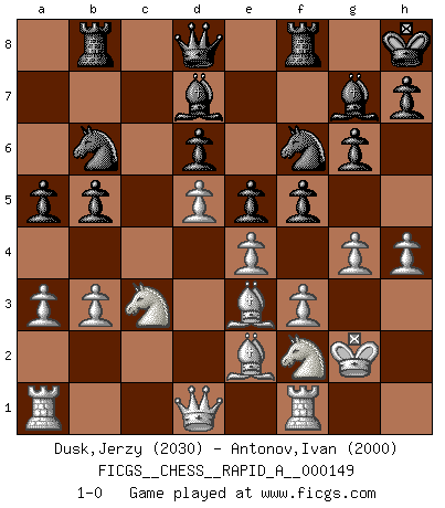 Last move : 1-0 2014 January 16 11:14:12 [Event "FICGS__CHESS__RAPID_A__000149"] [Site "FICGS"] [Date "2013.10.07"] [Round "1"] [White "Dusk,Jerzy"] [Black "Antonov,Ivan"] [Result "1-0"] [WhiteElo "2030"] [BlackElo "2000"] 1.d4 Nf6 2.c4 g6 3.Nc3 Bg7 4.e4 d6 5.Nf3 O-O 6.Be2 e5 7.O-O Nc6 8.d5 Ne7 9.Ne1 Nd7 10.f3 f5 11.g4 Kh8 12.h4 c6 13.Be3 Nf6 14.Nd3 b5 15.Nb4 cxd5 16.cxd5 Bd7 17.a3 a5 18.Nd3 Rb8 19.Nf2 Nc8 20.Kg2 Nb6 21.b3 1-0 This chess game has been lost on time (started : 2013.10.07 16:18:49) King's Indian : Orthodox, Aronin-Taimanov variation (Yugoslav attack / Mar del Plata variation) Kingside Castling by player Black (move 5) Kingside Castling by player White (move 7) Player White won this chess game. Follow this game move after move (download)I like to say that Bobby Fischer was the greatest player ever. But what made Fischer a genius was his ability to blend an American freshness and pragmatism with Russian ideas about strategy. (Bruce Pandolfini) Vom Schach wurde gesagt das Leben sei dafür nicht lange genug. Aber das ist der Fehler des Lebens, nicht des Schach'. (Irving Chernev) No es una movida, aún la mejor movida que tu debas buscar, sino un plan comprensible. (Eugene Znosko-Borovsky) Il s'avisa de me proposer d'apprendre les échecs qu'il jouait un peu... me voilà forcené des échecs. J'achète un échiquier, je m'enferme dans ma chambre, j'y passe des jours et des nuits à vouloir apprendre par cur toutes les parties. (Jean-Jacques Rousseau, Confessions) Happy endings are just stories that haven't finished yet. (Jane Smith in Mr & Mrs Smith)