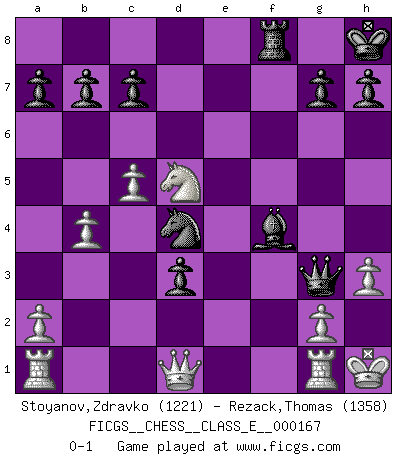 Last move : 0-1 2013 December 11 14:0:53 [Event "FICGS__CHESS__CLASS_E__000167"] [Site "FICGS"] [Date "2013.10.09"] [Round "1"] [White "Stoyanov,Zdravko"] [Black "Rezack,Thomas"] [Result "0-1"] [WhiteElo "1221"] [BlackElo "1358"] 1.e4 d6 2.h3 e5 3.Nf3 Nf6 4.c3 Bd7 5.Bc4 Nxe4 6.d3 Nf6 7.Ng5 Be7 8.Nxf7 Qc8 9.Nxh8 d5 10.Bb3 Kf8 11.O-O Kg8 12.Bxd5+ Nxd5 13.Re1 Nc6 14.Qf3 Kxh8 15.Qxd5 Be6 16.Qf3 Qd7 17.b4 Rf8 18.Qg3 Bd6 19.Re4 Ne7 20.Bg5 Nf5 21.Qg4 Bd5 22.Re1 Qf7 23.c4 Be6 24.c5 Nd4 25.Qd1 Qxf2+ 26.Kh1 Bd5 27.Rg1 e4 28.Nc3 exd3 29.Nxd5 Qg3 30.Bf4 Bxf4 0-1 King's pawn Opening Kingside Castling by player White (move 11) Player Black won this chess game. Follow this game move after move (download)A chess genius has died; a loss for humanity. (Viktor Kortchnoi, about Bobby Fischer's death) Karpov ist ein Museumsstück. (Garry Kasparov) Las piezas de Ajedrez son los bloques del alfabeto que moldean los pensamientos; y esos pensamientos, aunque hagan un diseño visual en el tablero, expresan abstractamente su belleza como un poema. (Marcel Duchamp) La tactique, c'est ce que vous faites quand il y a quelque chose à faire; la stratégie, c'est ce que vous faites quand il n'y a rien à faire. (Savielli Tartacower) A shortcut is the longest distance between two points. (Don Groves)