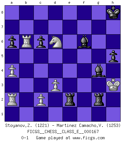Last move : 0-1 2013 November 16 5:6:34 [Event "FICGS__CHESS__CLASS_E__000167"] [Site "FICGS"] [Date "2013.10.09"] [Round "1"] [White "Stoyanov,Zdravko"] [Black "Martinez Camacho,Victor Hugo"] [Result "0-1"] [WhiteElo "1221"] [BlackElo "1253"] 1.e4 e5 2.Nf3 Nc6 3.Bb5 a6 4.Bxc6 dxc6 5.h3 Nf6 6.d3 Be7 7.O-O O-O 8.a3 Be6 9.Nxe5 Bd6 10.Nf3 Qd7 11.e5 Bxh3 12.exf6 gxf6 13.Nh2 Bf5 14.Qh5 Bg6 15.Qh6 Rfe8 16.Be3 Bf8 17.Qf4 Rac8 18.Qxf6 Bg7 19.Qf4 Bxb2 20.Ra2 Bg7 21.Ng4 Re6 22.Nd2 Rce8 23.Nc4 h5 24.Nh6+ Kh8 25.Nxf7+ Qxf7 26.Qxf7 Bxf7 27.a4 Rg6 28.Rb1 b6 29.Bxb6 cxb6 30.Rxb6 Re1+ 31.Kh2 Bd5 32.f3 Re2 33.Kh3 R6xg2 34.Kh4 Bxf3 35.Nd6 Bf6+ 36.Kh3 Bg4+ 0-1 Ruy Lopez : Exchange variation Kingside Castling by player White (move 7) Kingside Castling by player Black (move 7) Player Black won this chess game. Follow this game move after move (download)My God, Bobby Fischer plays so simply. (Alexei Suetin) Ich verstehe den Grund nicht, warum die Aufteilung in Frauen und Männer überhaupt im Schach besteht. (Judith Polgar) El Ajedrez detiene a su maestro dentro de sus propios vínculos, encadenando la mente y el cerebro, por lo que la libertad interior del mas fuerte debe sufrir. (Albert Einstein) Le génie consiste à savoir transgresser les règles au moment opportun. (Teichmann) Once you start thinking you have nothing left to learn, you have everything to learn. (Steve Badget)