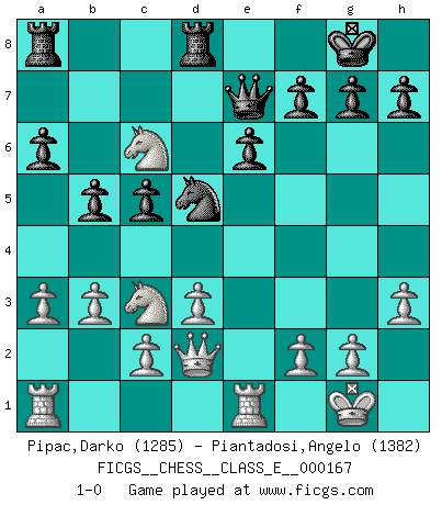 Last move : 1-0 2013 October 31 1:3:7 [Event "FICGS__CHESS__CLASS_E__000167"] [Site "FICGS"] [Date "2013.10.09"] [Round "1"] [White "Pipac,Darko"] [Black "Piantadosi,Angelo"] [Result "1-0"] [WhiteElo "1285"] [BlackElo "1382"] 1.e4 c5 2.Nf3 d6 3.Nc3 Nc6 4.Bb5 Bd7 5.b3 Nf6 6.h3 e6 7.O-O Be7 8.d3 O-O 9.Re1 a6 10.Bxc6 Bxc6 11.Bg5 b5 12.a3 Qc7 13.Qd2 Rfd8 14.e5 dxe5 15.Nxe5 Nd5 16.Bxe7 Qxe7 17.Nxc6 1-0 Sicilian Kingside Castling by player White (move 7) Kingside Castling by player Black (move 8) Player White won this chess game. Follow this game move after move (download)By the beauty of his games, the clarity of his play, and the brilliance of his ideas, Fischer made himself an artist of the same stature as Brahms, Rembrandt, and Shakespeare. (David Levy) Die Idee von Capablanca, Schach als Fach in den Schulen zu lehren, ist großartig. (Fidel Castro) En la perfecta combinación de Ajedrez como en una historia corta de primera clase, toda la trama y contra trama deberá conducir hacia un final sorprendente, el interes no es mitigado hasta el último momento. (Yates and Winter) Il vaut mieux sacrifier les pièces de l'adversaire. (Xavier Tartacover) Now you put water in a cup, it becomes the cup; You put water into a bottle it becomes the bottle; You put it in a teapot it becomes the teapot. Water can flow or it can crash. Be water, my friend. (Bruce Lee)