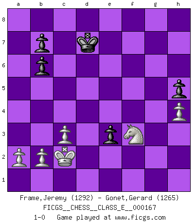 Last move : 1-0 2013 October 17 23:15:27 [Event "FICGS__CHESS__CLASS_E__000167"] [Site "FICGS"] [Date "2013.10.09"] [Round "1"] [White "Frame,Jeremy"] [Black "Gonet,Gerard"] [Result "1-0"] [WhiteElo "1292"] [BlackElo "1265"] 1.e4 Nc6 2.d4 d5 3.e5 f6 4.Bd3 g6 5.Nf3 Bg4 6.c3 Bg7 7.O-O fxe5 8.dxe5 Bxf3 9.Qxf3 Nxe5 10.Qe3 Qd6 11.f4 Nxd3 12.Qxd3 O-O-O 13.Be3 Nf6 14.Bd4 Rhf8 15.Na3 Kb8 16.Bxa7+ Kc8 17.Bd4 Nh5 18.Bxg7 Nxg7 19.Qb5 Rxf4 20.Rxf4 Qxf4 21.Rf1 Qd6 22.Rd1 e5 23.Nc4 Qe6 24.Na5 Qb6+ 25.Qxb6 cxb6 26.Nb3 Ne6 27.Kf2 e4 28.Ke3 g5 29.g3 h5 30.Rf1 Rf8 31.Rxf8+ Nxf8 32.Kd4 Nd7 33.Kxd5 e3 34.Nd4 Nf6+ 35.Kc4 Ng4 36.h4 gxh4 37.gxh4 Ne5+ 38.Kb3 Nf3 39.Nxf3 Kd7 40.Kc2 1-0 KP : Nimzovich defense Kingside Castling by player White (move 7) Queenside Castling by player Black (move 12) Player White won this chess game. Follow this game move after move (download)You can only get good at Chess if you love the game. (Bobby Fischer) Schach ist ein Reich, wo sich die menschliche Phantasie frei entfalten kann. (David Bronstein) El Ajedrez lo es todo: arte, ciencia y deporte. (Anatoly Karpov) Aux échecs, l'amour-propre est satisfait quand on remporte la victoire, mais il n'y a pas de honte à être battu. (Benjamin Franklin) In theory there is no difference between theory and practice. In practice there is. (Yogi Berra)