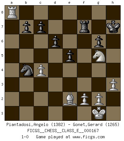 Last move : 1-0 2013 November 19 11:22:34 [Event "FICGS__CHESS__CLASS_E__000167"] [Site "FICGS"] [Date "2013.10.09"] [Round "1"] [White "Piantadosi,Angelo"] [Black "Gonet,Gerard"] [Result "1-0"] [WhiteElo "1382"] [BlackElo "1265"] 1.d4 Nf6 2.c4 g6 3.Nc3 Bg7 4.e4 d6 5.Nf3 O-O 6.Be2 e5 7.d5 Na6 8.O-O Nc5 9.Qc2 a5 10.Be3 Ncd7 11.a3 Ng4 12.Bd2 Nc5 13.b4 axb4 14.axb4 Rxa1 15.Rxa1 Na6 16.h3 Nh6 17.Qb1 f5 18.Qc1 fxe4 19.Nxe4 Bf5 20.Neg5 Qd7 21.Ne6 Bxe6 22.dxe6 Qxe6 23.Bxh6 Bxh6 24.Qxh6 Nxb4 25.Qxh7+ Kxh7 26.Ng5+ Kg8 27.Nxe6 Rf7 28.Ra8+ Kh7 29.Ng5+ 1-0 King's Indian : Petrosian system Kingside Castling by player Black (move 5) Kingside Castling by player White (move 8) Player White won this chess game. Follow this game move after move (download)Fischer is under obligation to nobody. (Joseph Platz) Ein unbeabsichtigtes Patt ist der Gipfel der Dummheit. (Anonymous) Nunca nadie ha ganado una partida de Ajedrez rindiendose. (Unknown) Si je n'étais pas joueur d'échecs, je serais le meilleur dans quelque chose d'autre. (Anatoli Karpov) God, you are such an idiot. - Actually, I thought I was more of a jerk. (Gregory House to Stacy Warner, House M.D.)