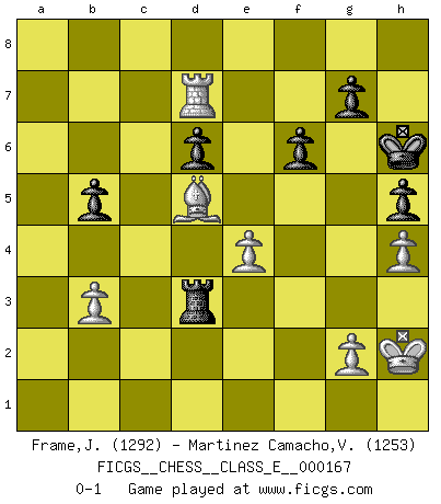 Last move : 0-1 2013 December 2 13:59:20 [Event "FICGS__CHESS__CLASS_E__000167"] [Site "FICGS"] [Date "2013.10.09"] [Round "1"] [White "Frame,Jeremy"] [Black "Martinez Camacho,Victor Hugo"] [Result "0-1"] [WhiteElo "1292"] [BlackElo "1253"] 1.e4 e5 2.Nf3 Nf6 3.Nc3 Nc6 4.Bc4 Bb4 5.d3 O-O 6.Bd2 d6 7.O-O Bg4 8.h3 Be6 9.Nd5 Bxd2 10.Qxd2 Bxd5 11.exd5 Na5 12.Qxa5 b6 13.Qc3 Rc8 14.Nd2 Qd7 15.Ne4 Nxe4 16.dxe4 c6 17.Qd3 cxd5 18.Bxd5 Kh8 19.f4 exf4 20.Rxf4 Rc7 21.Raf1 f6 22.Bb3 Rd8 23.Qd5 Rc5 24.Qe6 Qxe6 25.Bxe6 Rxc2 26.R4f2 Rc5 27.a4 a6 28.Bd5 b5 29.axb5 axb5 30.b3 h6 31.Ra1 Kh7 32.Rfa2 Rdc8 33.Ra7 Kg6 34.h4 h5 35.Re7 R8c7 36.Ra7 Rxa7 37.Rxa7 Rc1+ 38.Kf2 Rd1 39.Rd7 Rd2+ 40.Kg3 Rd3+ 41.Kh2 Kh6 0-1 Petrov Three knights game Kingside Castling by player Black (move 5) Kingside Castling by player White (move 7) Player Black won this chess game. Follow this game move after move (download)The enormous mental resilience, without which no Chess player can exist, was so much taken up by Chess that he could never free his mind of this game. (Albert Einstein) Ein Gewinn durch eine ungenaue Kombination, sei sie auch noch so vorzeigbar, erfüllt mich mit Schaudern. (Wilhelm Steinitz) Solo los afeminados hacen el Enroque. (Rob Sillars) Celui qui prend des risques peut perdre, celui qui n'en prend pas perd toujours. (Xavier Tartacover) The beginning is the most important part of the work. (Plato)