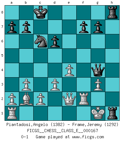 Last move : 0-1 2013 November 13 1:4:31 [Event "FICGS__CHESS__CLASS_E__000167"] [Site "FICGS"] [Date "2013.10.09"] [Round "1"] [White "Piantadosi,Angelo"] [Black "Frame,Jeremy"] [Result "0-1"] [WhiteElo "1382"] [BlackElo "1292"] 1.b3 e5 2.Bb2 Nc6 3.Nf3 d6 4.g3 Nf6 5.Bg2 h6 6.O-O Bg4 7.d3 Qd7 8.Nbd2 O-O-O 9.e4 h5 10.Qe1 Be7 11.Ng5 Nh7 12.Nxh7 Rxh7 13.Nc4 Rdh8 14.f4 h4 15.fxe5 hxg3 16.hxg3 Bh3 17.exd6 Bxd6 18.Nxd6+ cxd6 19.Rf2 Bxg2 20.Kxg2 Qg4 21.Qe2 Rh2+ 22.Kg1 Rh1+ 0-1 Nimzovich-Larsen attack : Modern variation Kingside Castling by player White (move 6) Queenside Castling by player Black (move 8) Player Black won this chess game. Follow this game move after move (download)Whoever sees no other aim in the game than that of giving checkmate to one's opponent will never become a good Chess player. (Euwe) Korrekt heißt in Deutschland die Haltung eines Mannes, dessen Benehmen nach dem Urteile seiner Nachbarn seiner Stellung angemessen ist. Um korrekt zu sein, muß man sich der Meinung der anderen anpassen... (Emanuel Lasker) Cuando no sepas que mover, espera por una idea que se le venga a la la cabeza de tu oponente. Tenlo por seguro de que esa idea estará incorrecta. (Siegbert Tarrasch) Des idées, des idées, j'en ai cent, j'en ai mille. Des bonnes, des mauvaises, applicables, irréalisables... Il suffit de faire le tri ! (Roos) A mistake is only a mistake if you let it happen twice. Otherwise it is a learning experience. (Daniel Parmet)