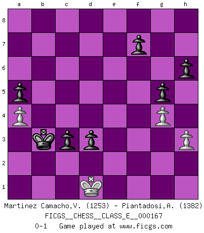 Last move : 0-1 2014 January 11 7:8:13 [Event "FICGS__CHESS__CLASS_E__000167"] [Site "FICGS"] [Date "2013.10.09"] [Round "1"] [White "Martinez Camacho,Victor Hugo"] [Black "Piantadosi,Angelo"] [Result "0-1"] [WhiteElo "1253"] [BlackElo "1382"] 1.e4 e6 2.d4 d5 3.Nd2 dxe4 4.Nxe4 Nd7 5.Nf3 Ngf6 6.Nxf6+ Nxf6 7.Bg5 Be7 8.Bc4 O-O 9.O-O b6 10.a3 Bb7 11.c3 h6 12.Bh4 Ne4 13.Bxe7 Qxe7 14.Rc1 Rfd8 15.Qc2 Ng5 16.Nxg5 Qxg5 17.g3 Qg4 18.Rfe1 Qf3 19.d5 exd5 20.Be2 Qe4 21.Bd3 Qg4 22.Qe2 Qh3 23.Qf3 Rab8 24.Qg2 Qg4 25.h3 Qd7 26.f3 d4 27.c4 c5 28.Kh2 Re8 29.Rxe8+ Rxe8 30.Rc2 Re3 31.Re2 Bxf3 32.Qf1 Bxe2 33.Bxe2 Qe7 34.Bf3 Qf6 35.Kg2 Qxf3+ 36.Qxf3 Rxf3 37.Kxf3 Kf8 38.Ke4 Ke7 39.b4 Ke6 40.bxc5 bxc5 41.a4 a5 42.g4 g5 43.Kd3 Ke5 44.Ke2 Ke4 45.Kd2 d3 46.Kd1 Kd4 47.Kd2 Kxc4 48.Kd1 Kb3 49.Kd2 c4 50.Kd1 c3 0-1 French : Tarrasch Kingside Castling by player Black (move 8) Kingside Castling by player White (move 9) Player Black won this chess game. Follow this game move after move (download)I play correspondence chess because it is both art and science while chess is art only. (A player at FICGS) Alle offensichtlichen Züge sehen nach dem Spiel in der Analyse verdächtig aus. (Viktor Kortschnoi) Nos gusta pensar. (Gary Kasparov) D'abord les bases : Jouez et étudiez, puis étudiez et jouez, ensuite jouez et étudiez, puis étudiez et jouez. Deuxièmement : Donnez toujours le meilleur de vous-même ! (Ken Smith) I know the human being and fish can coexist peacefully. (George W. Bush, Saginaw sept. 29, 2000)